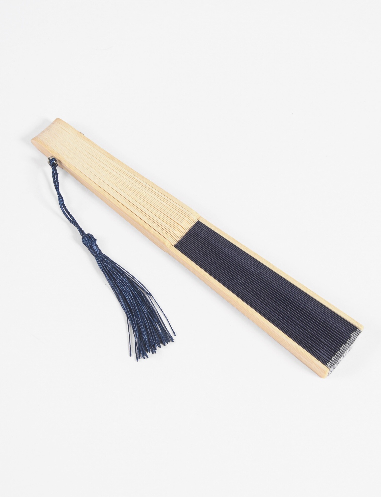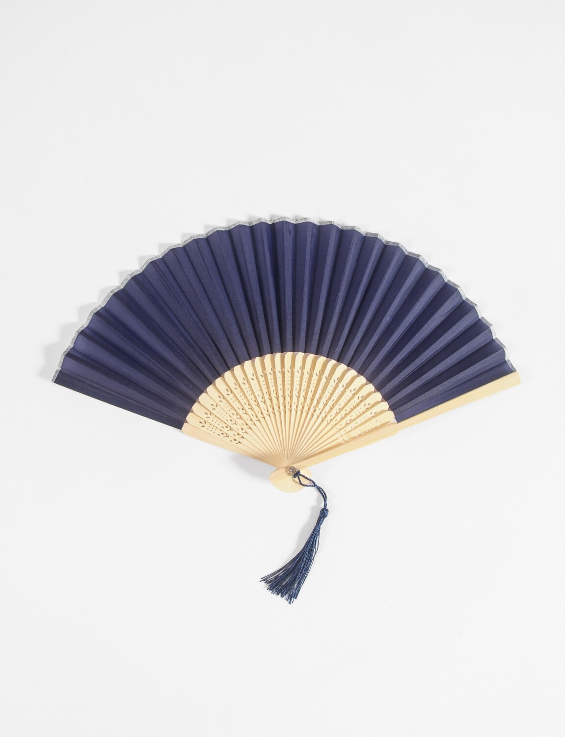- Abanico clásico de bambú con varillas caladas y tela lisa.