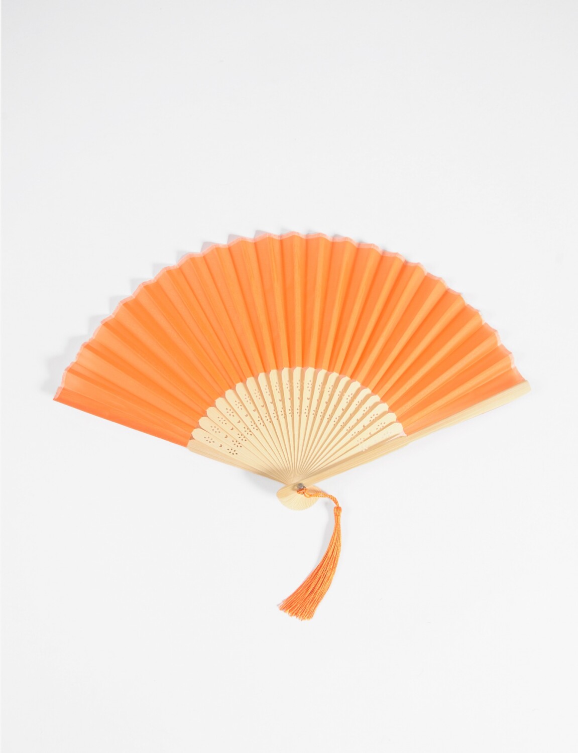 - Abanico clásico de bambú con varillas caladas y tela lisa.