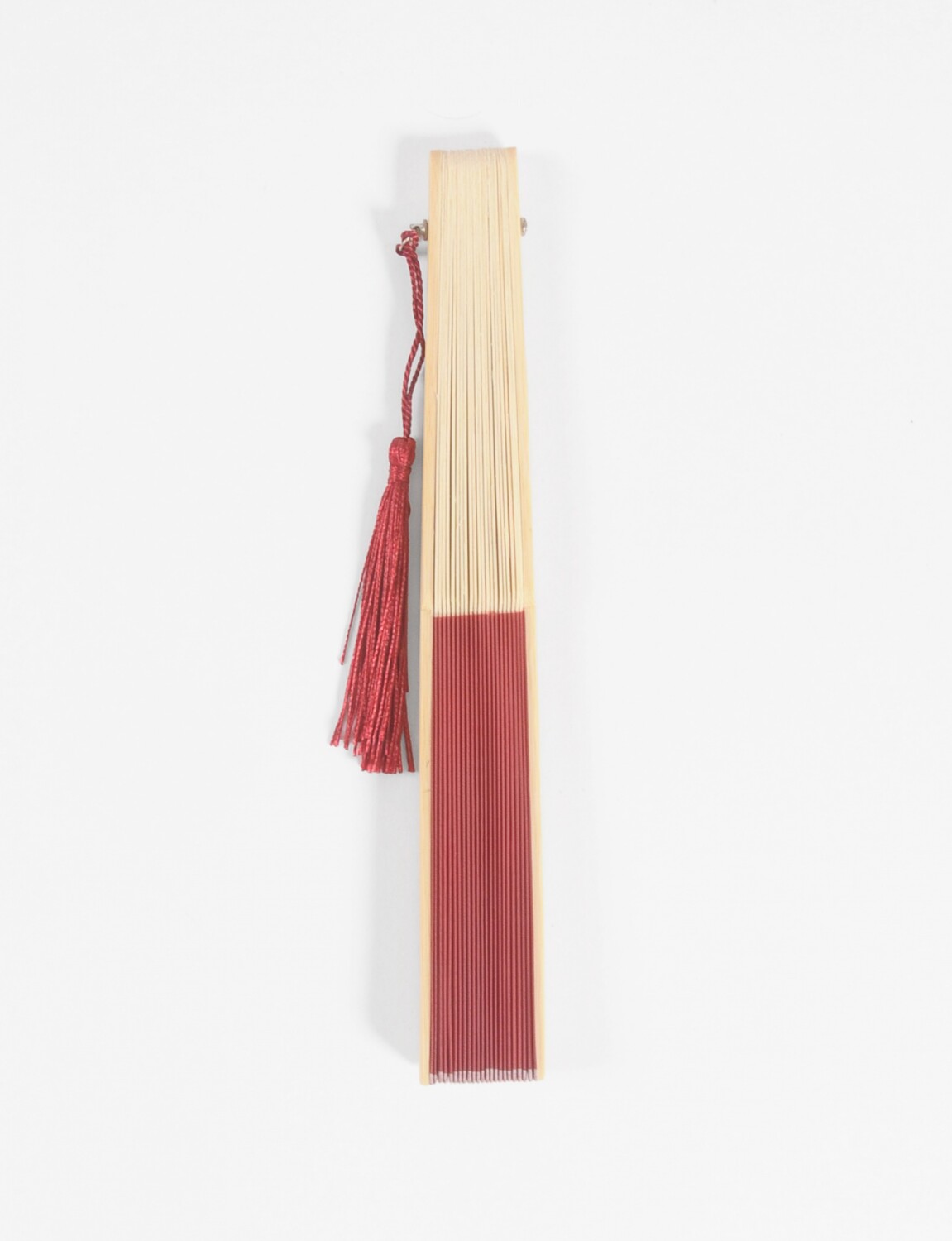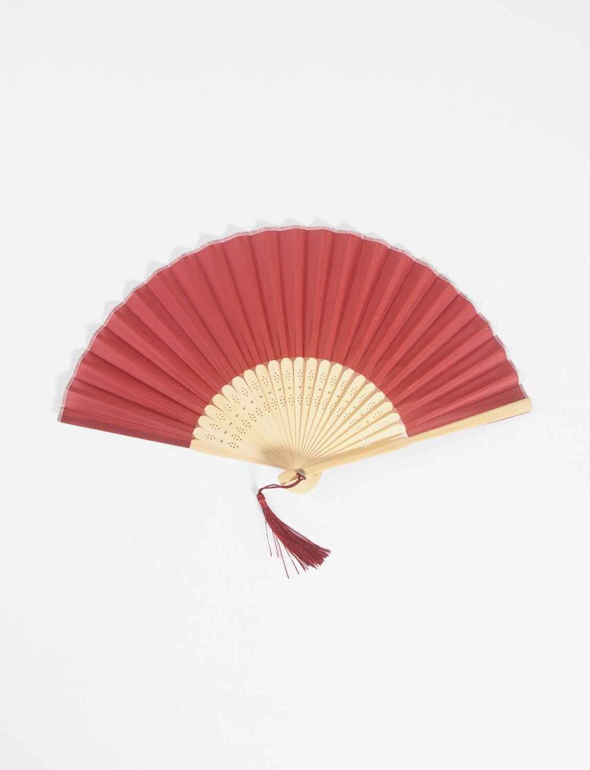 - Abanico clásico de bambú con varillas caladas y tela lisa.