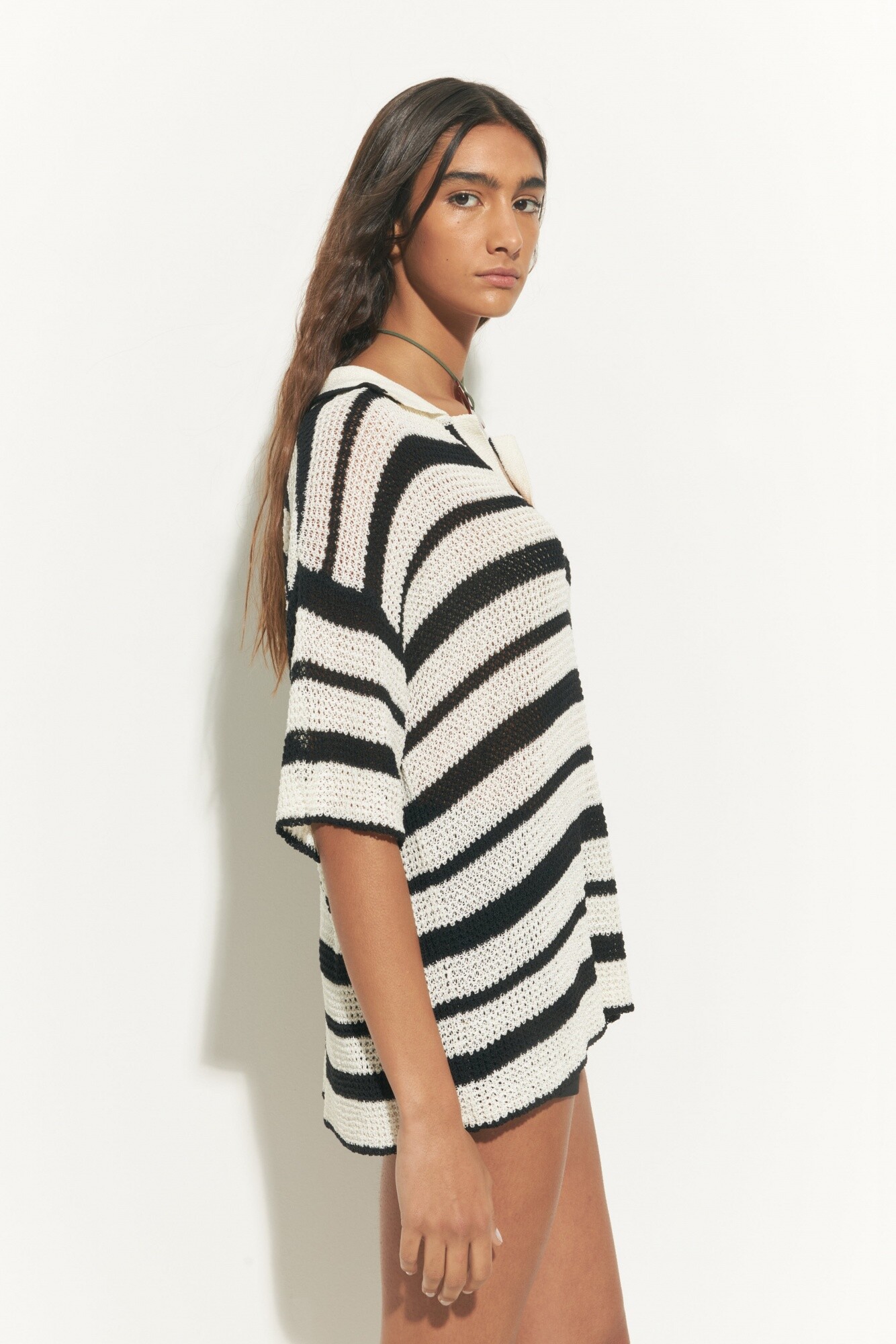 - Blusa tejida de manga corta con cuello tipo polo y diseño a rayas.