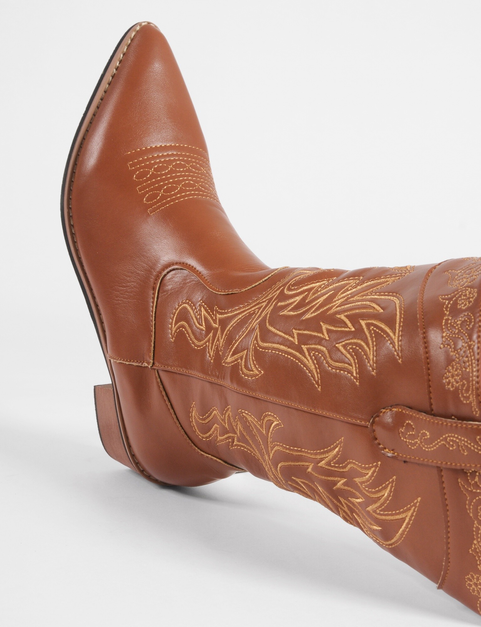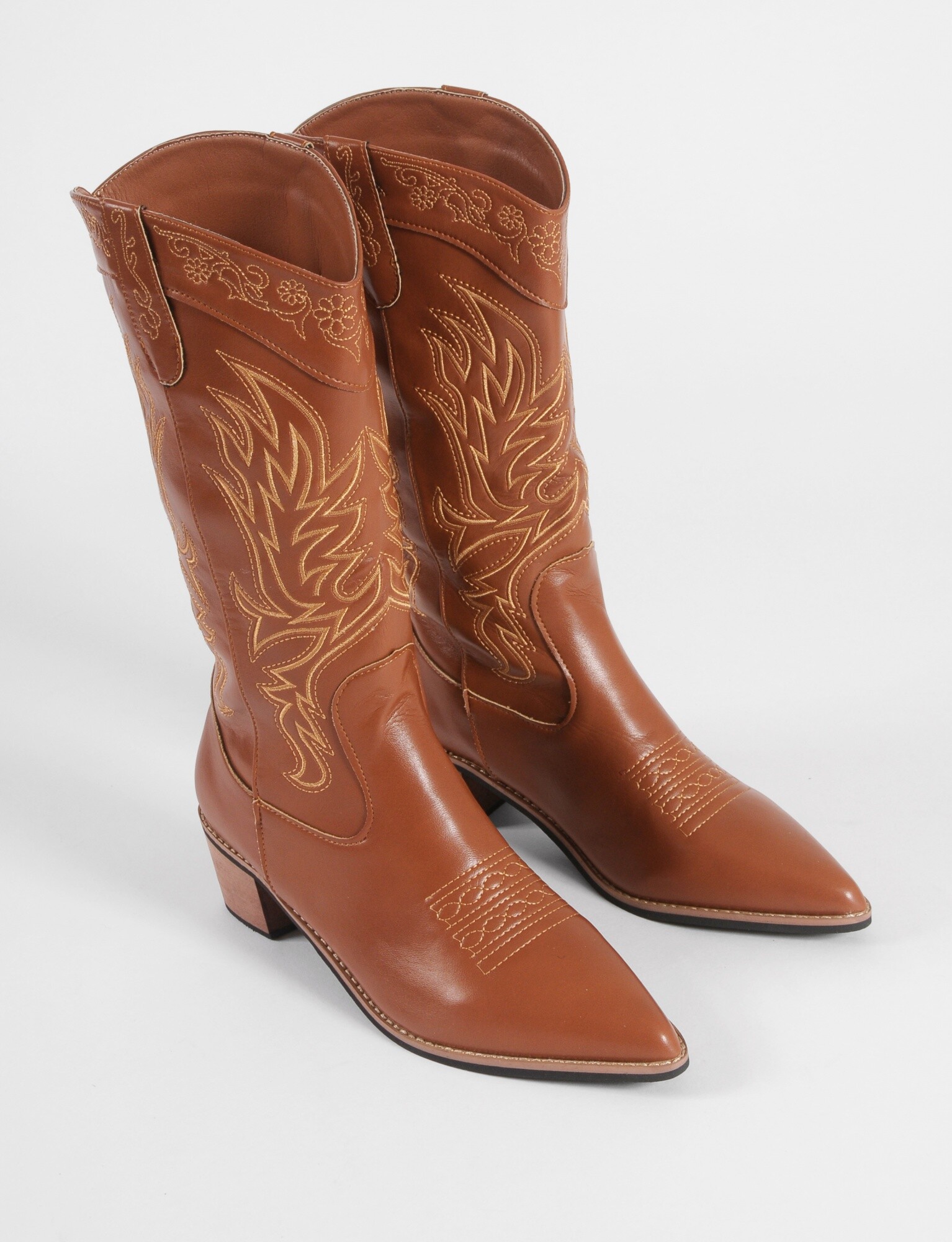 - Botas texanas de cuero vegano con bordado típico.