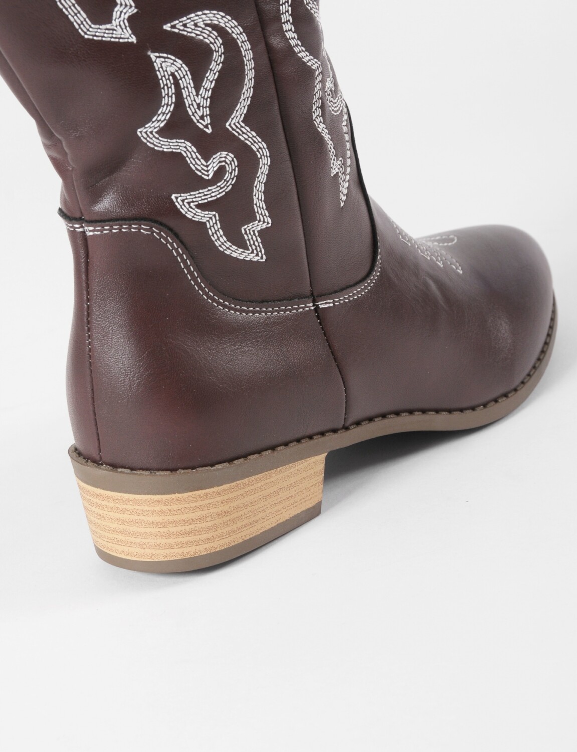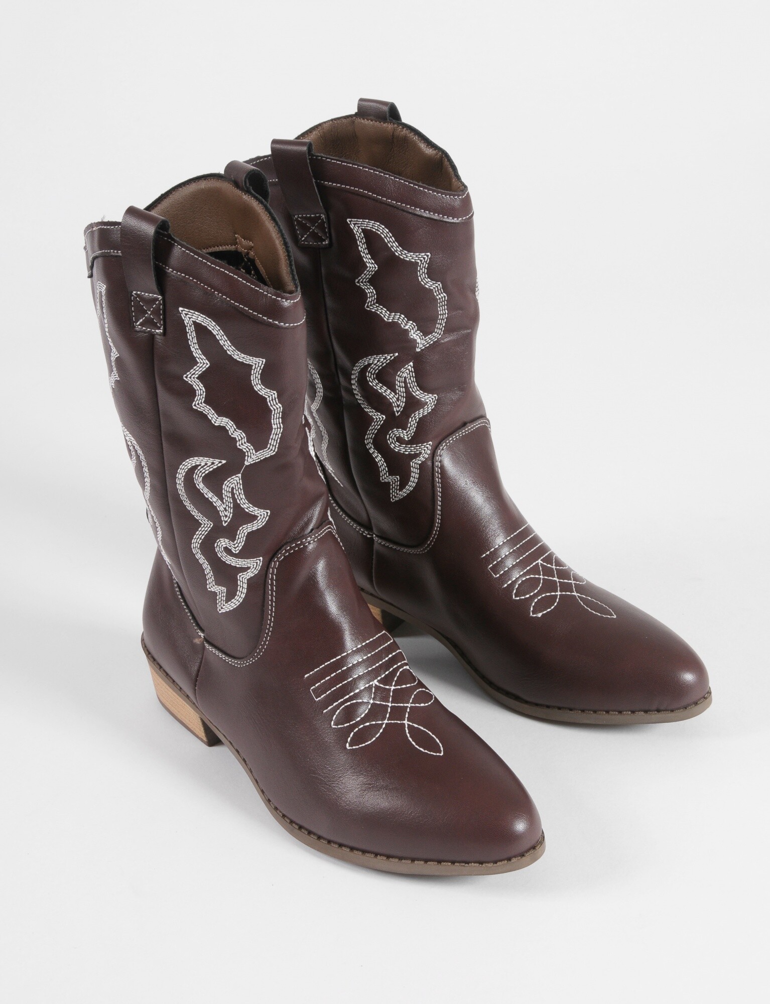 - Botas texanas oscuras de cuero vegano con bordado típico.