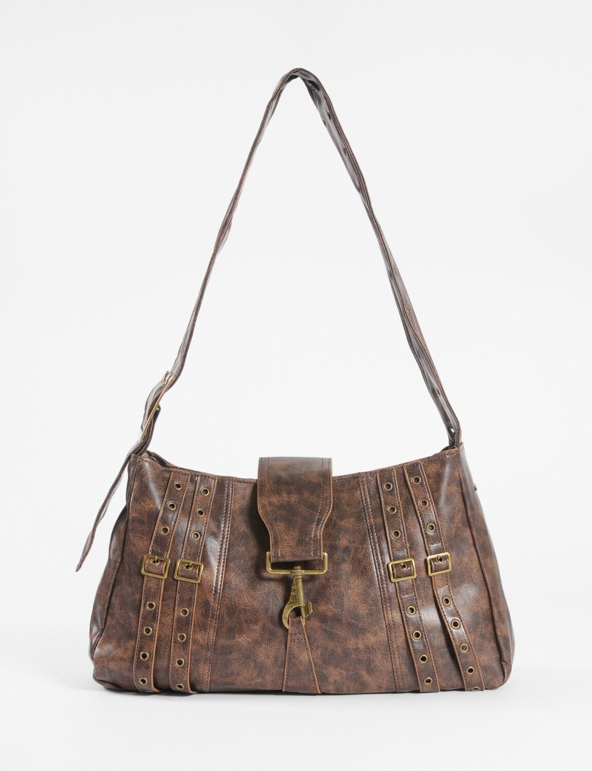 - Cartera con correa ajustable de cuero vegano con aspecto gastado.