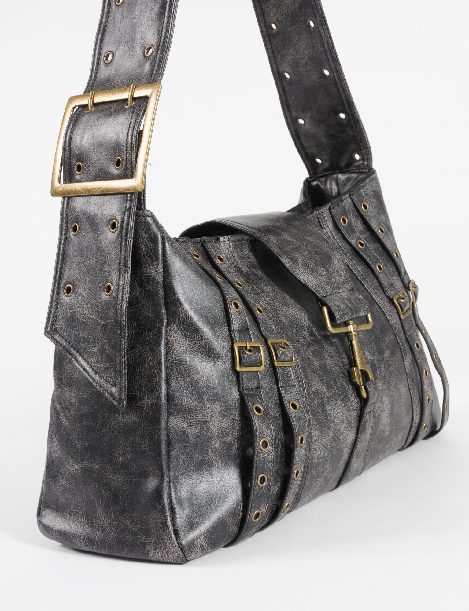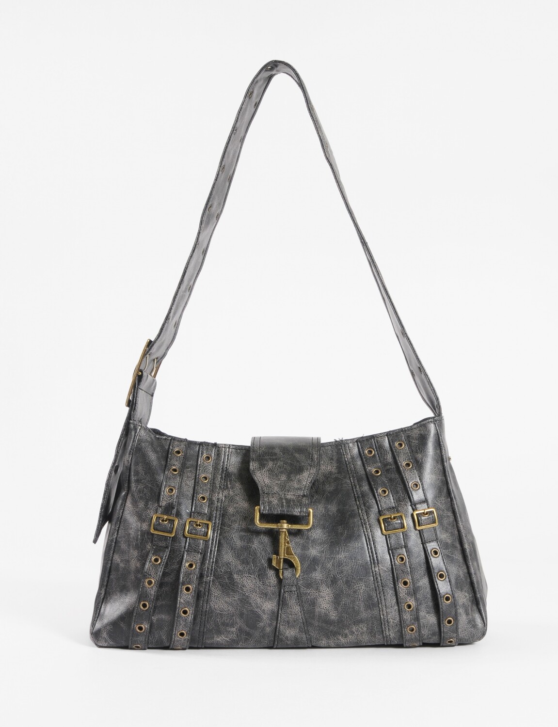 - Cartera con correa ajustable de cuero vegano con aspecto gastado.