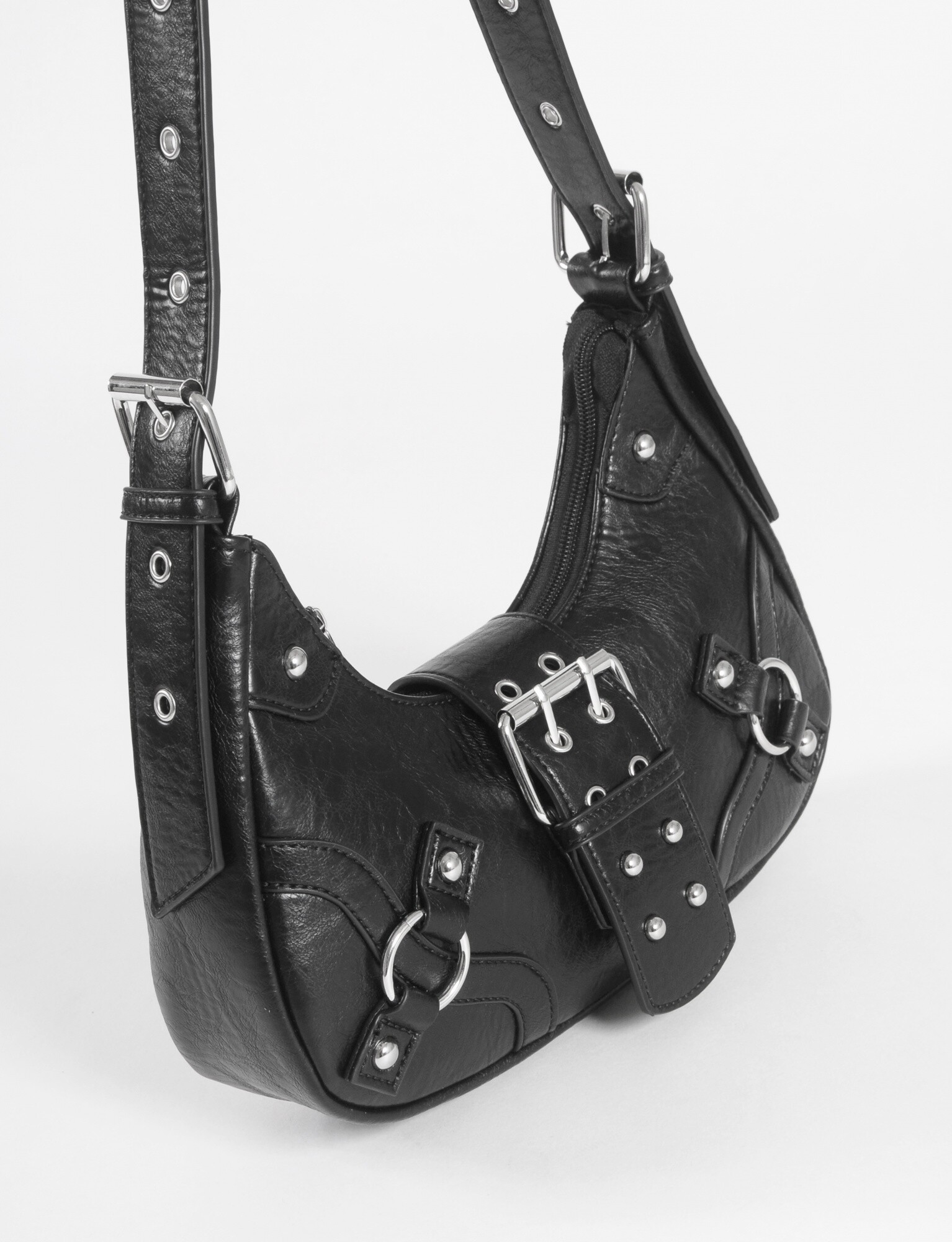 - Cartera de hombro con hebilla frontal y correa regulable.