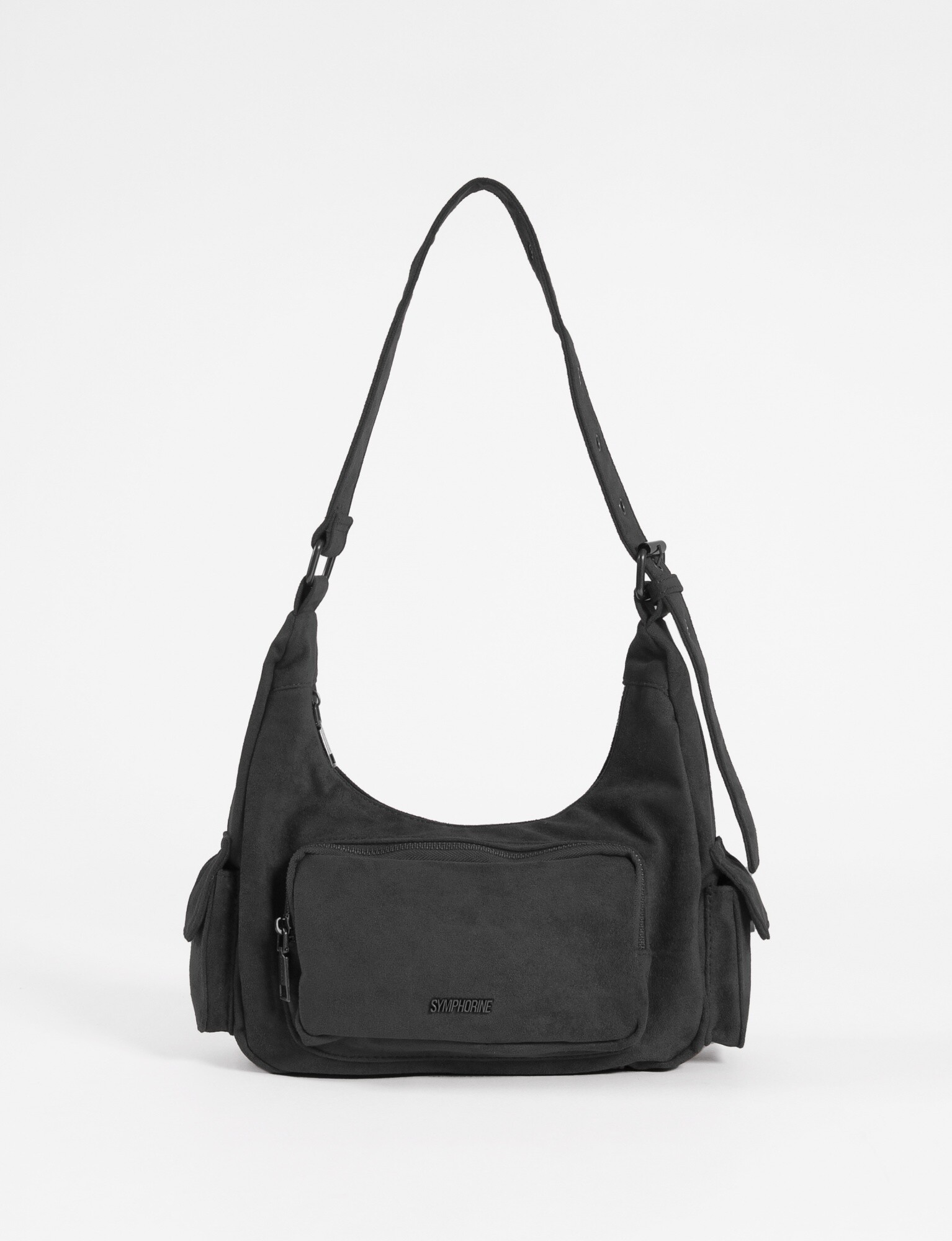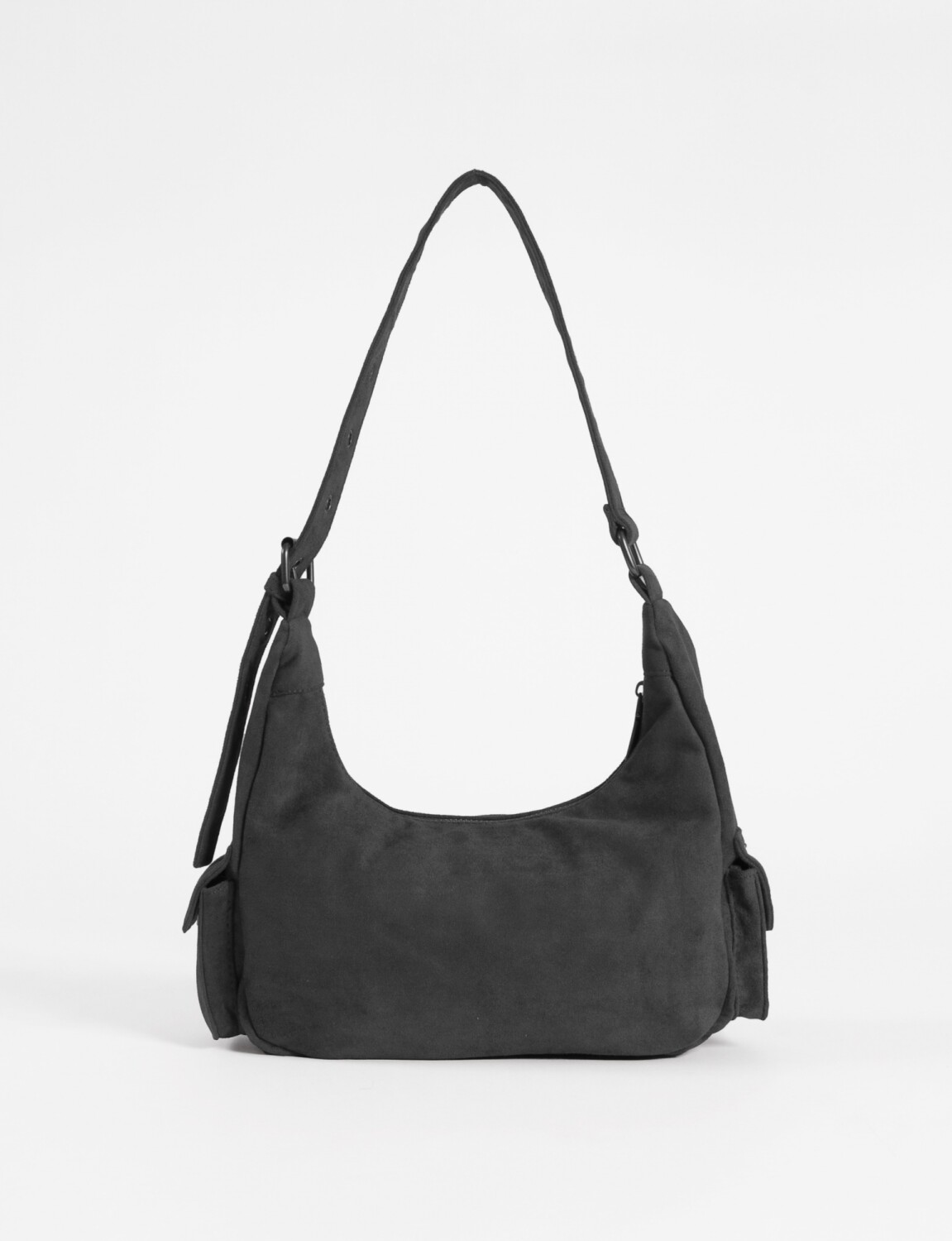 - Cartera de hombro de símil gamuza con bolsillo frontal y dos bolsillos laterales.