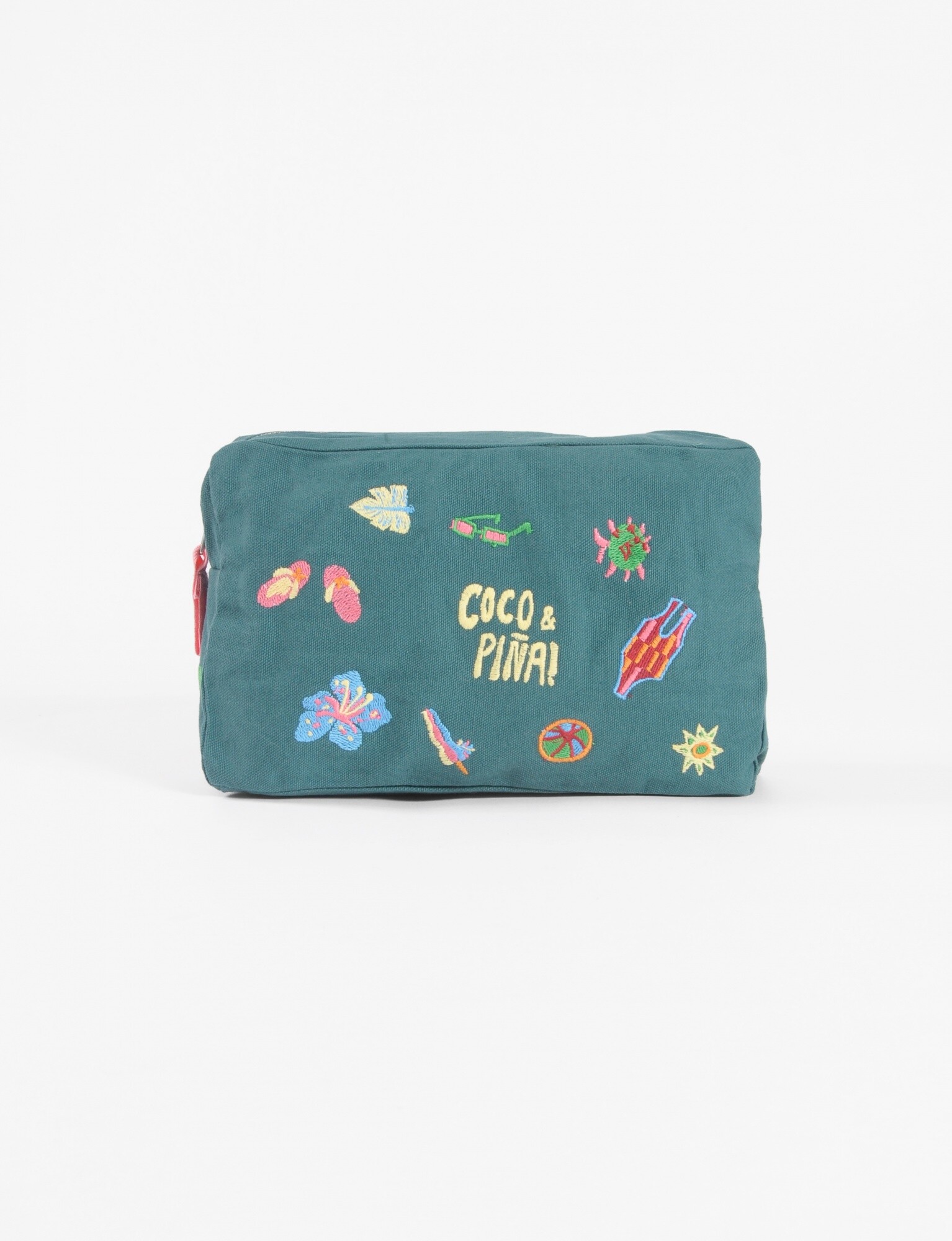 - Estuche rectangular con estampa de coco y piña y cierre superior.