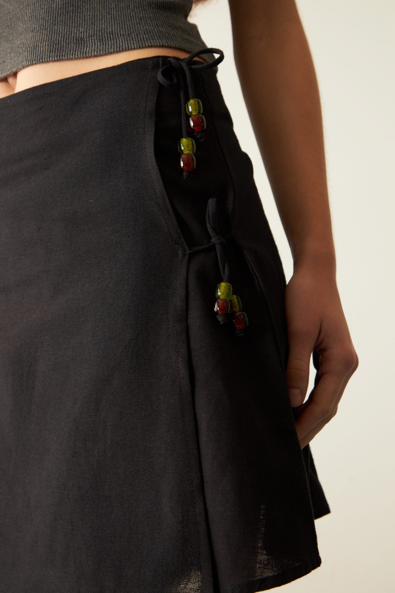 - Falda de tiro medio con aplicaciones de piedras en la parte superior.