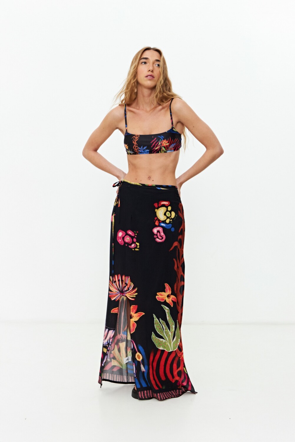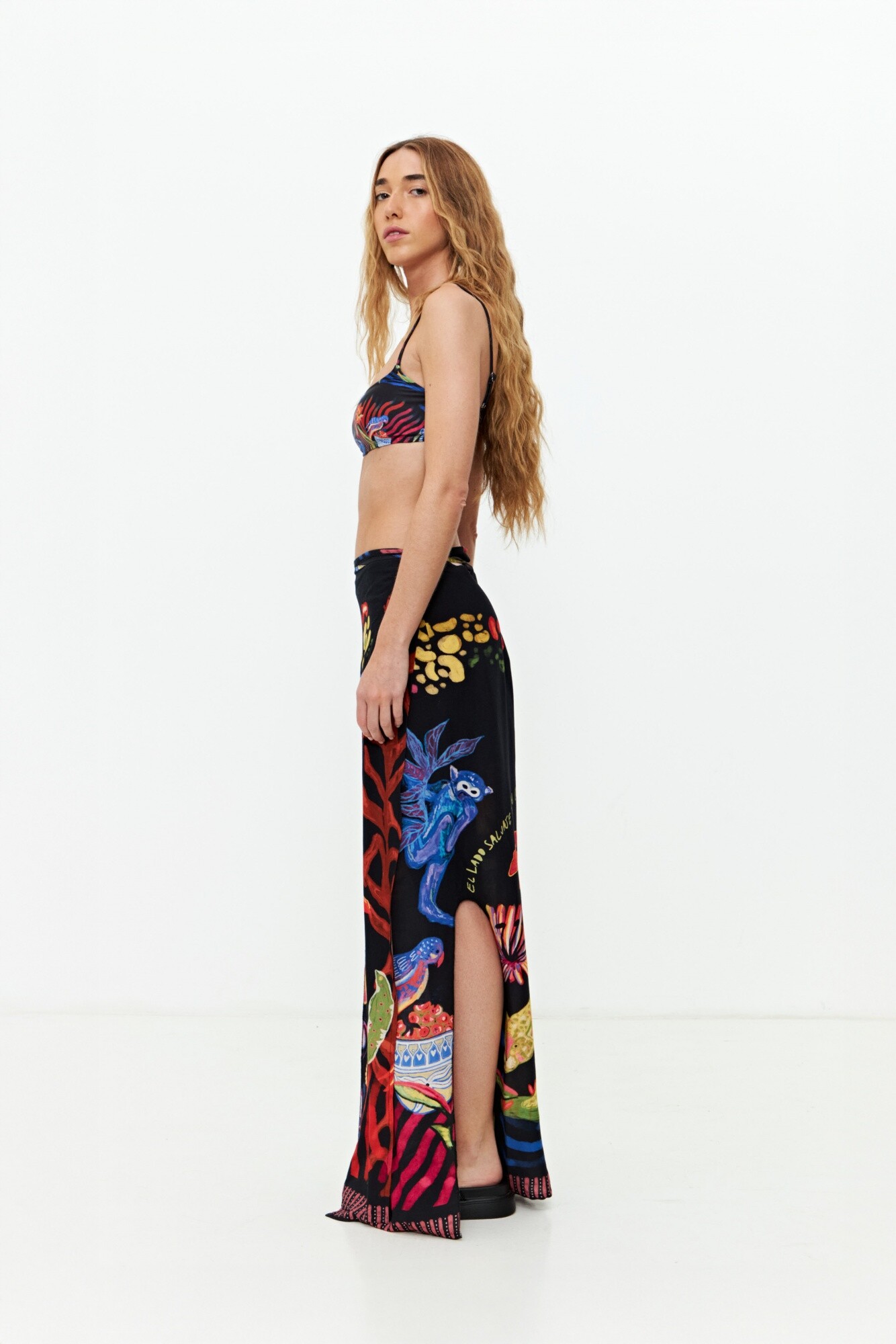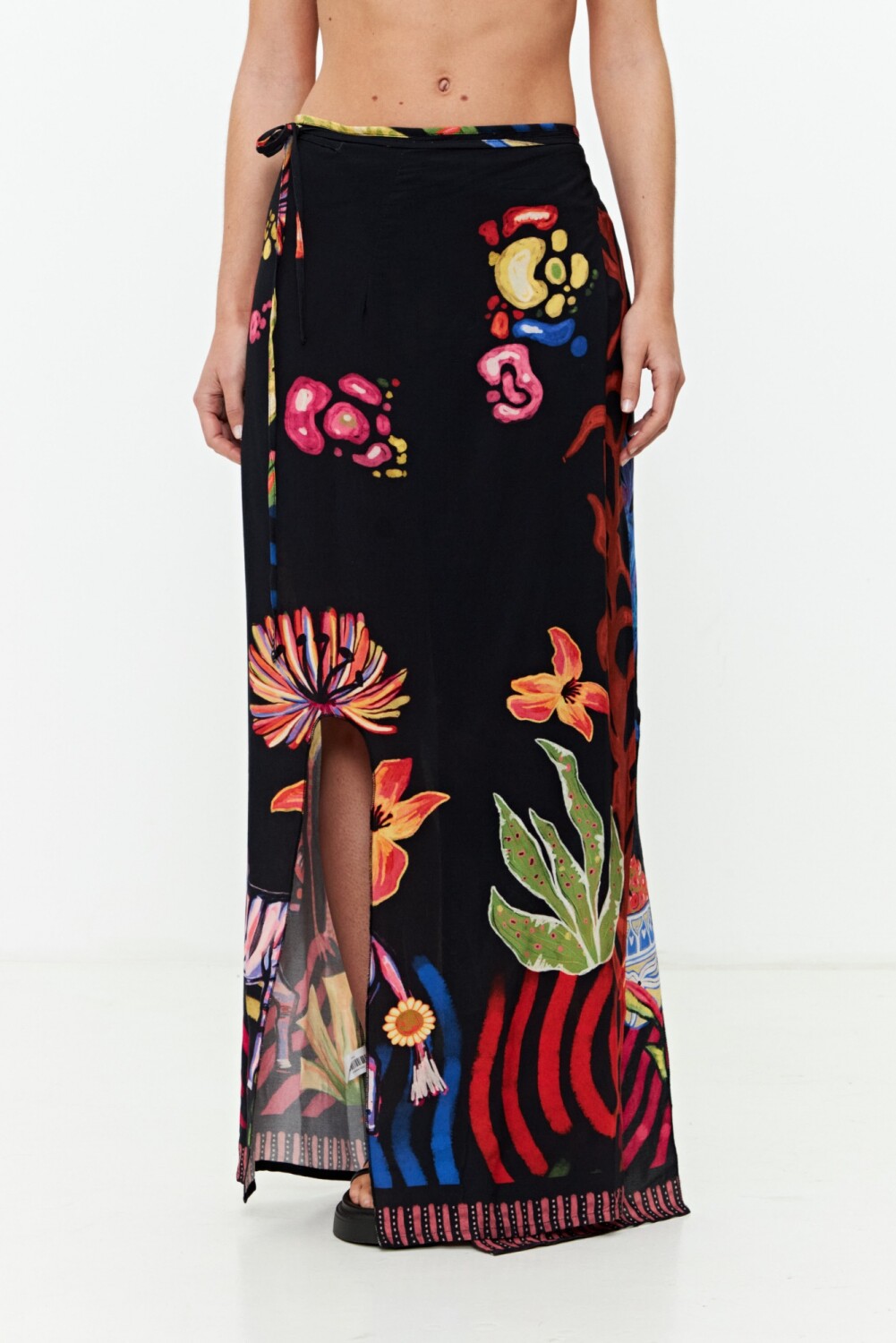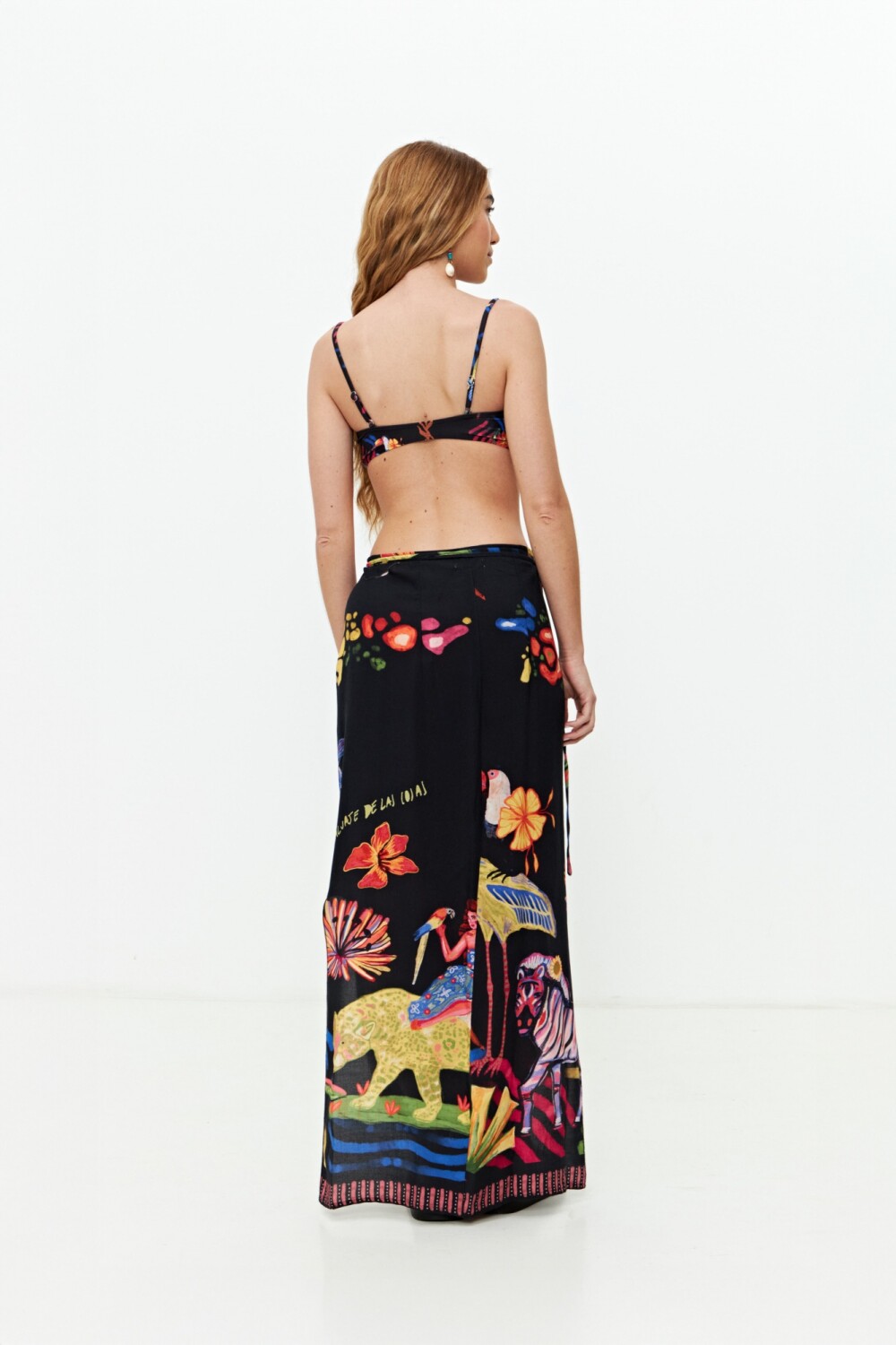 - Falda pareo larga con estampa jungla y amarre lateral.