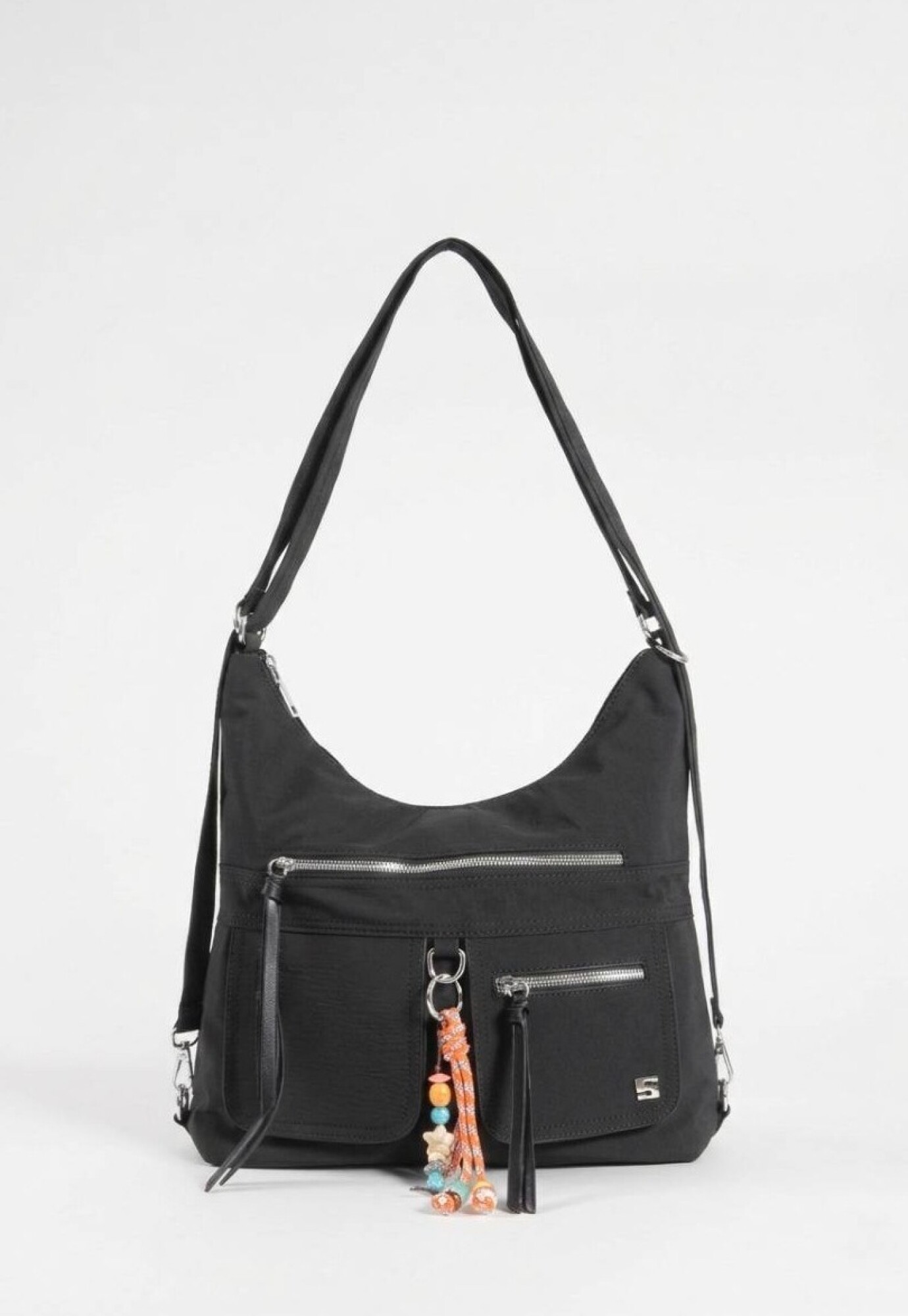 - Mochila - cartera hobo con correa regulable y bolsillos frontales con cierres.