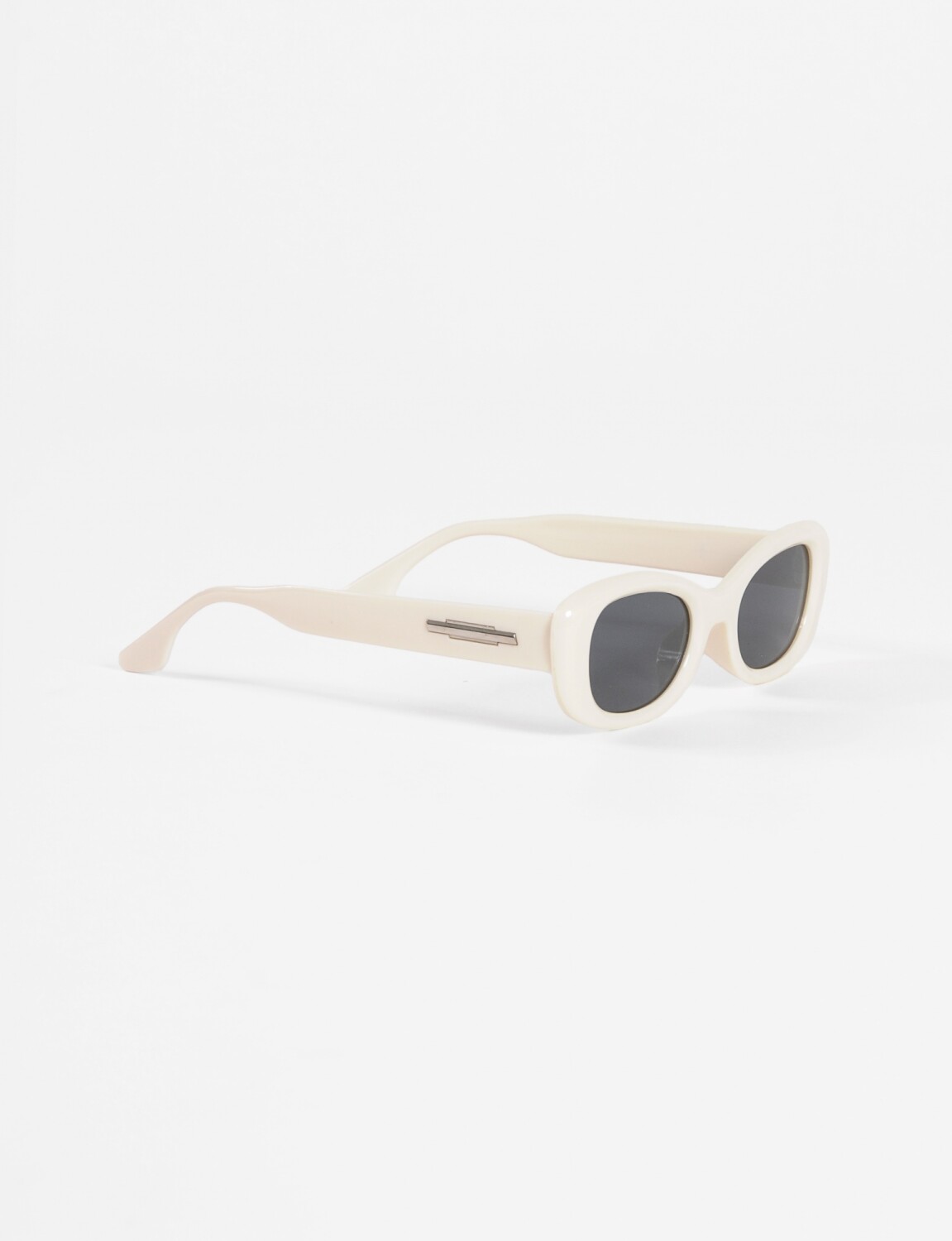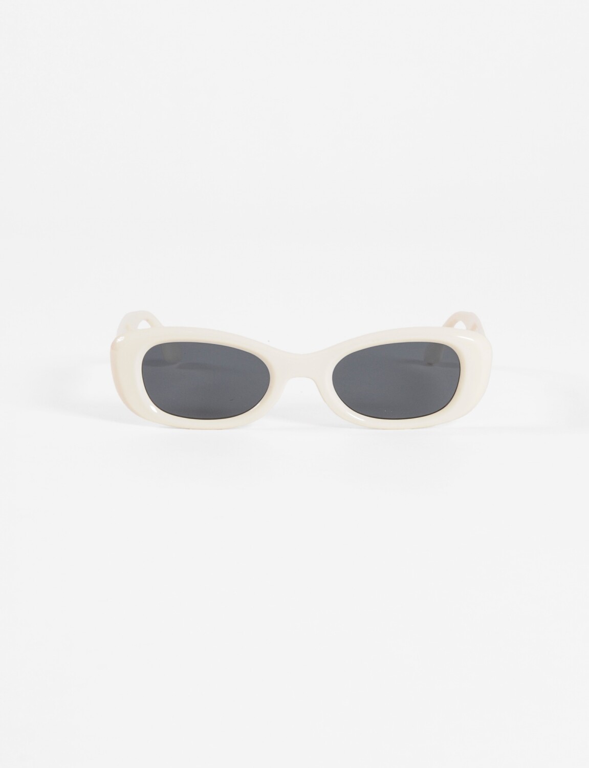 - Lentes de sol envolventes de marco ancho con líneas suaves.