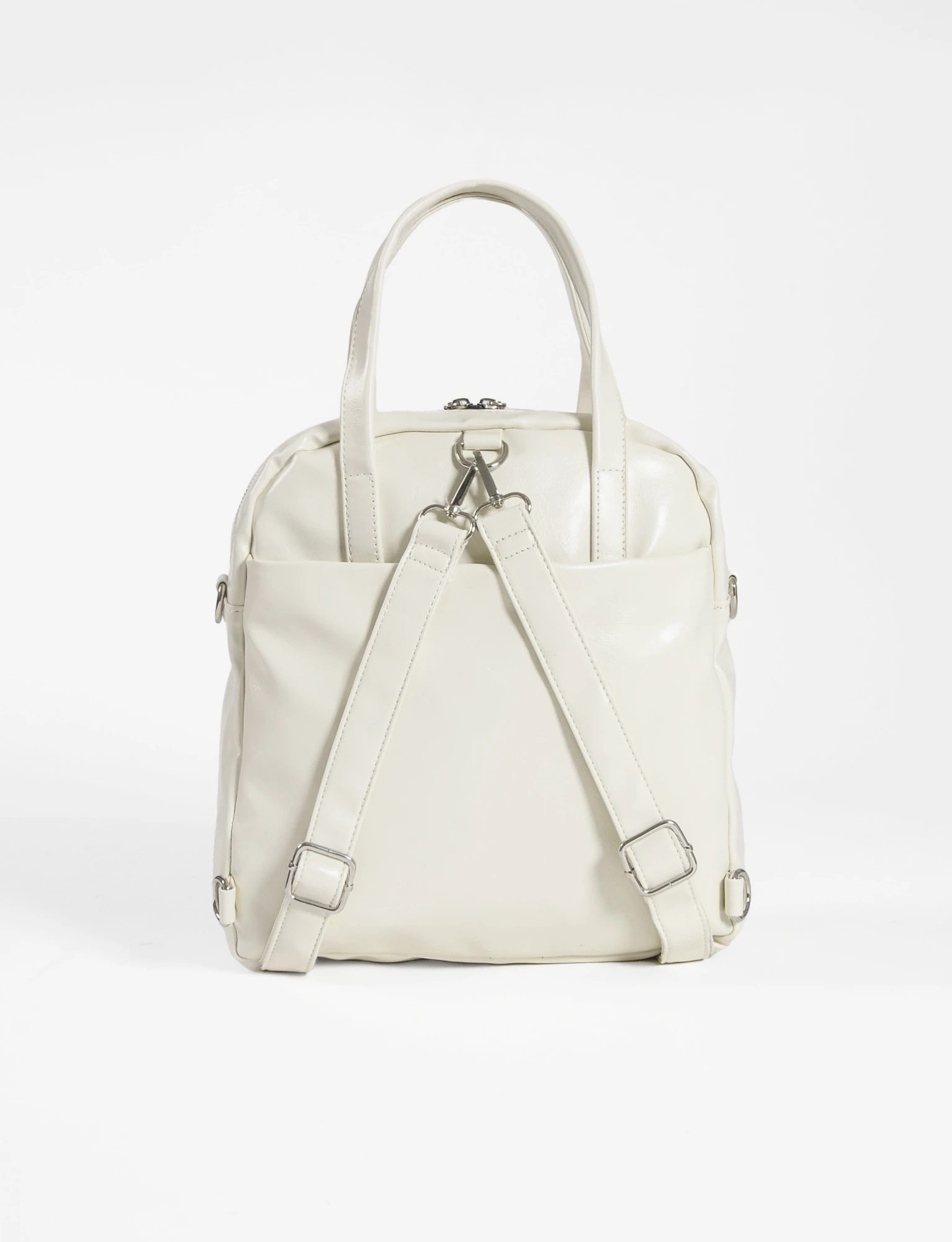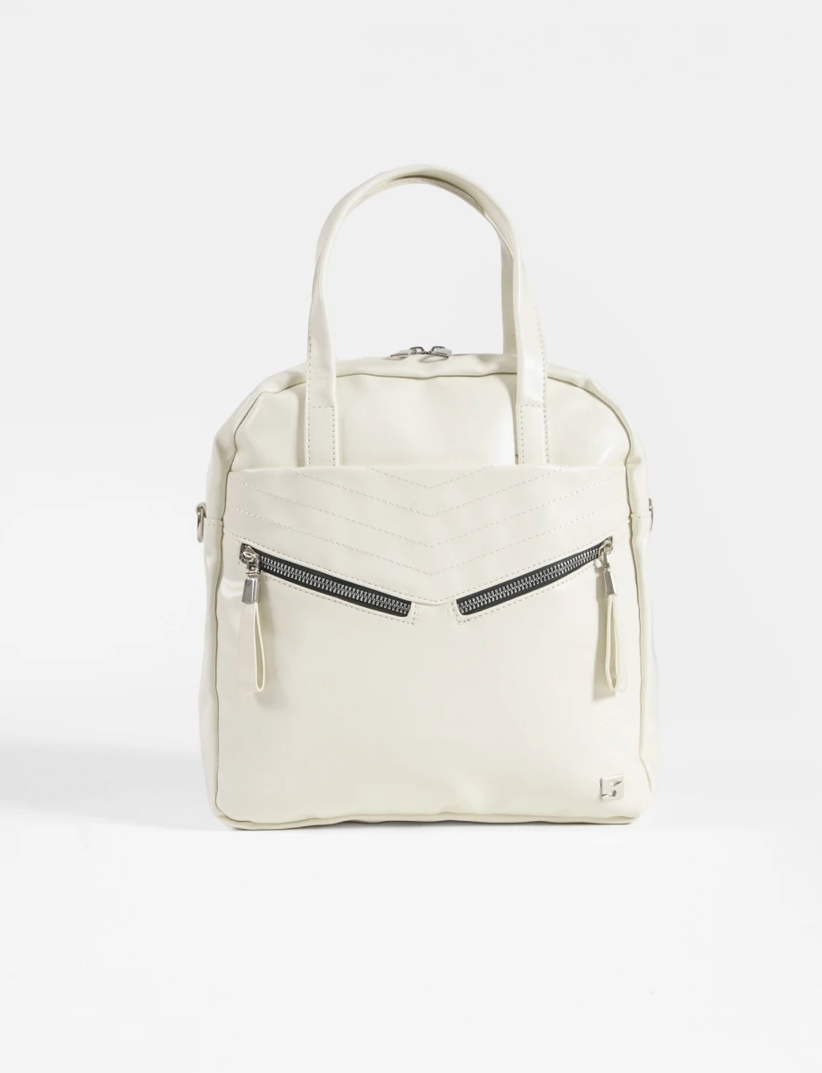 - Mochila que puede usarse como cartera cruzada, ya que viene con una correa de cuero sintético ajustable removible.