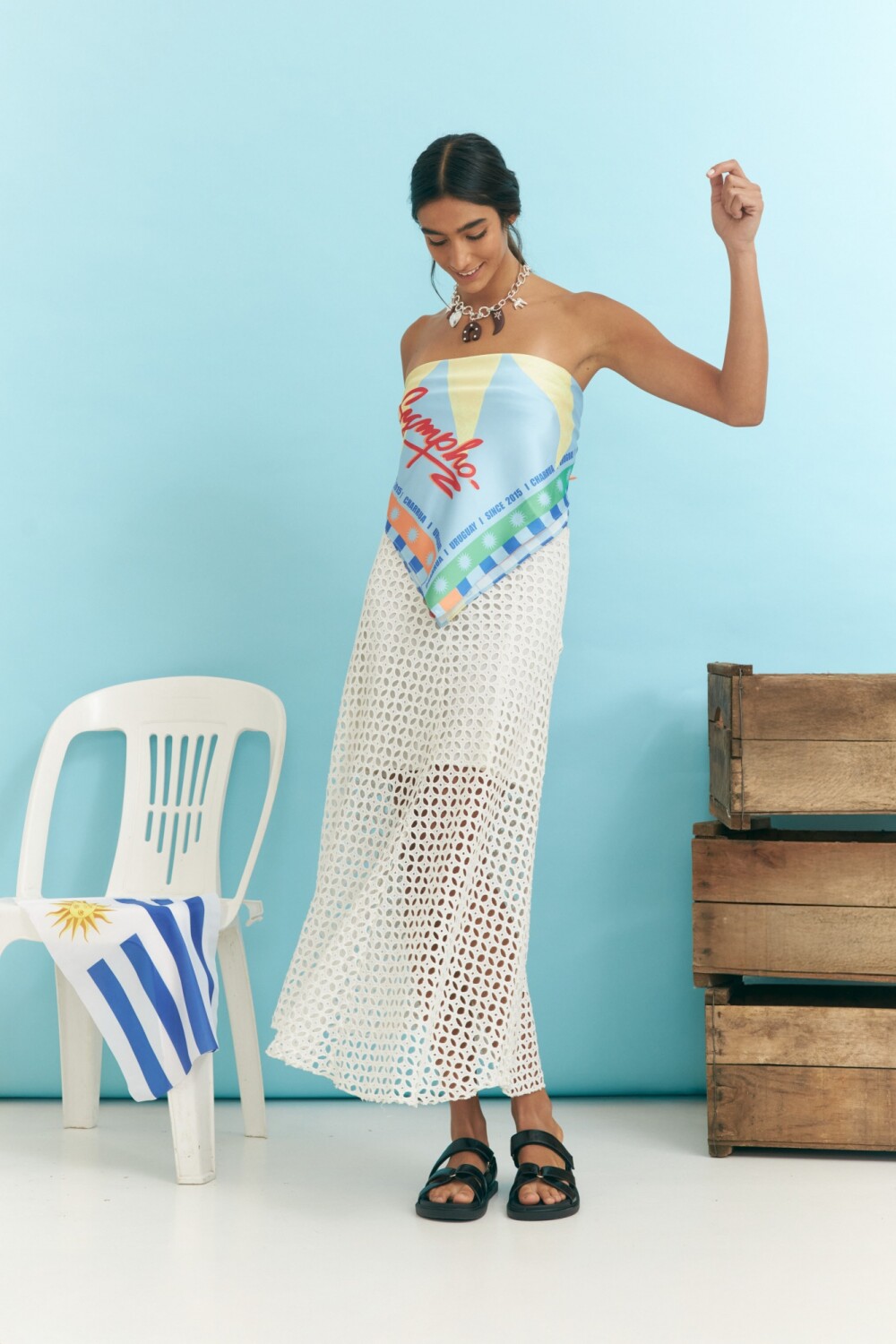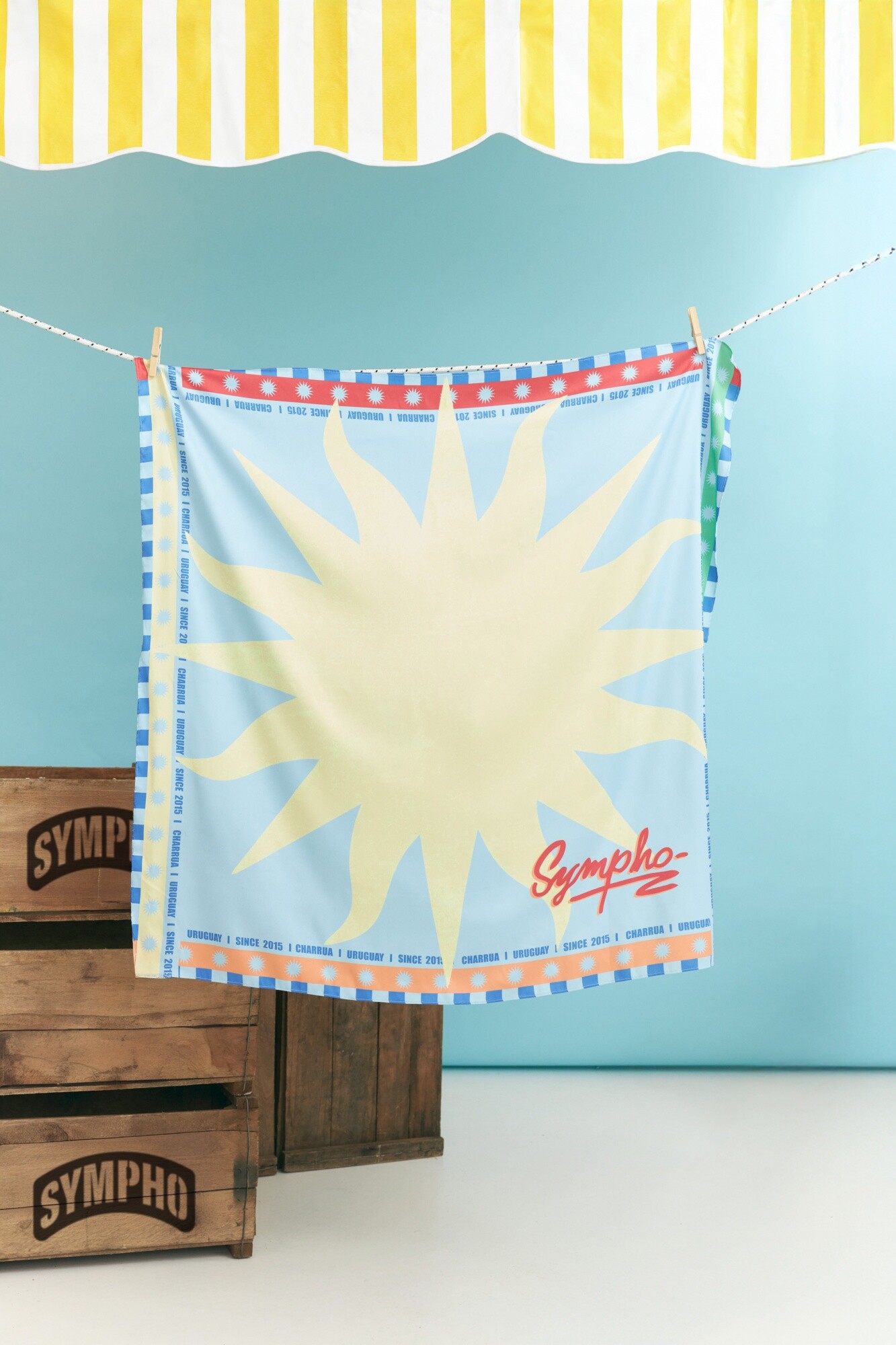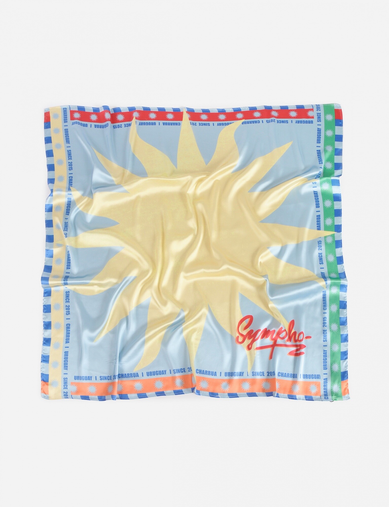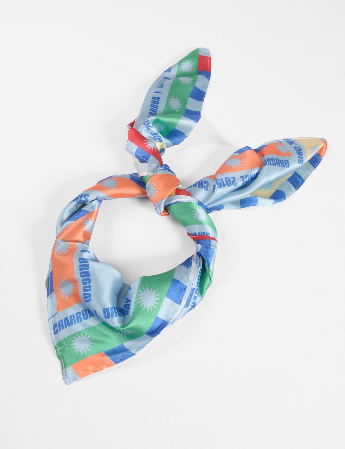 - Pañuelo con motivo charrúa aplicado sobre base de tela liviana.