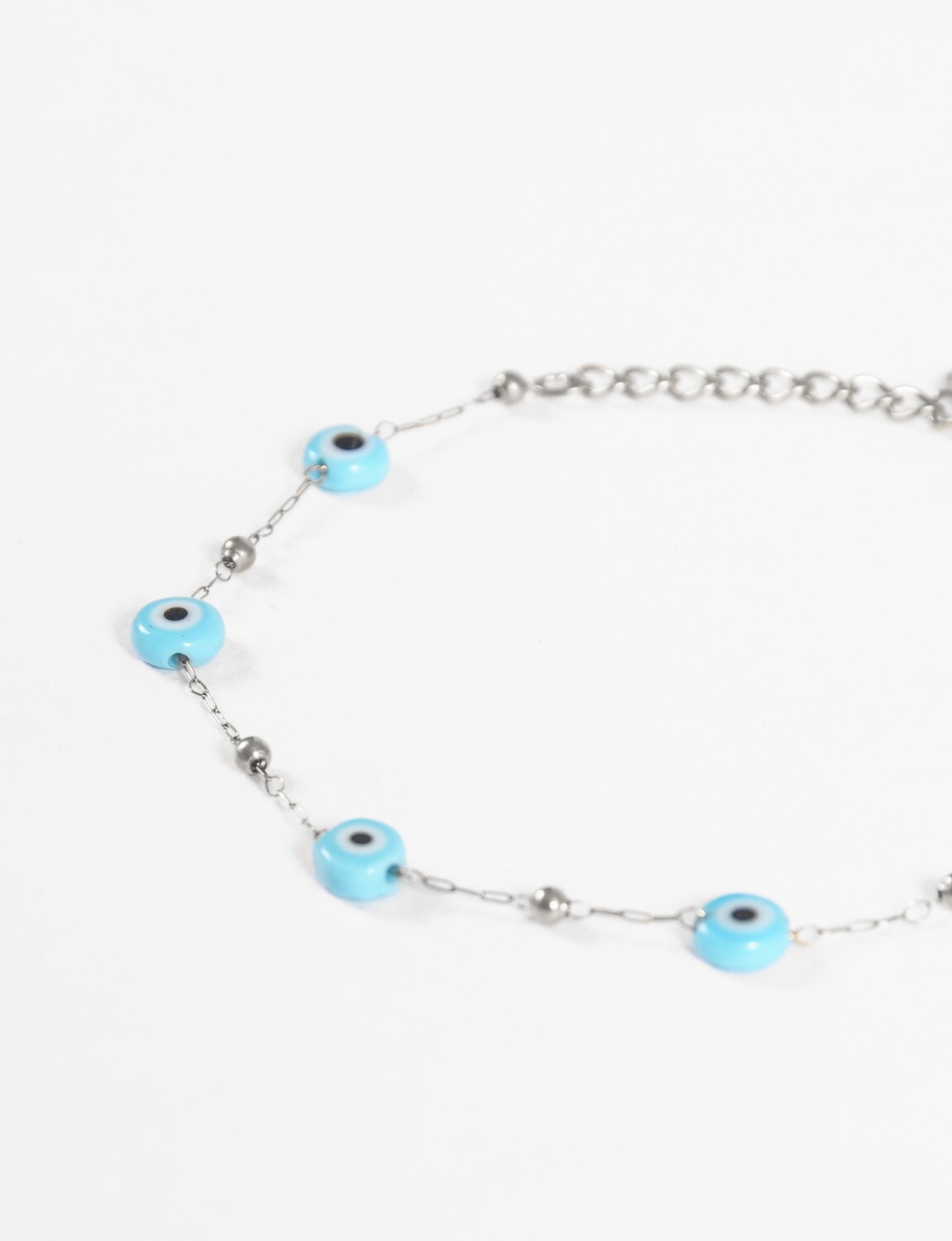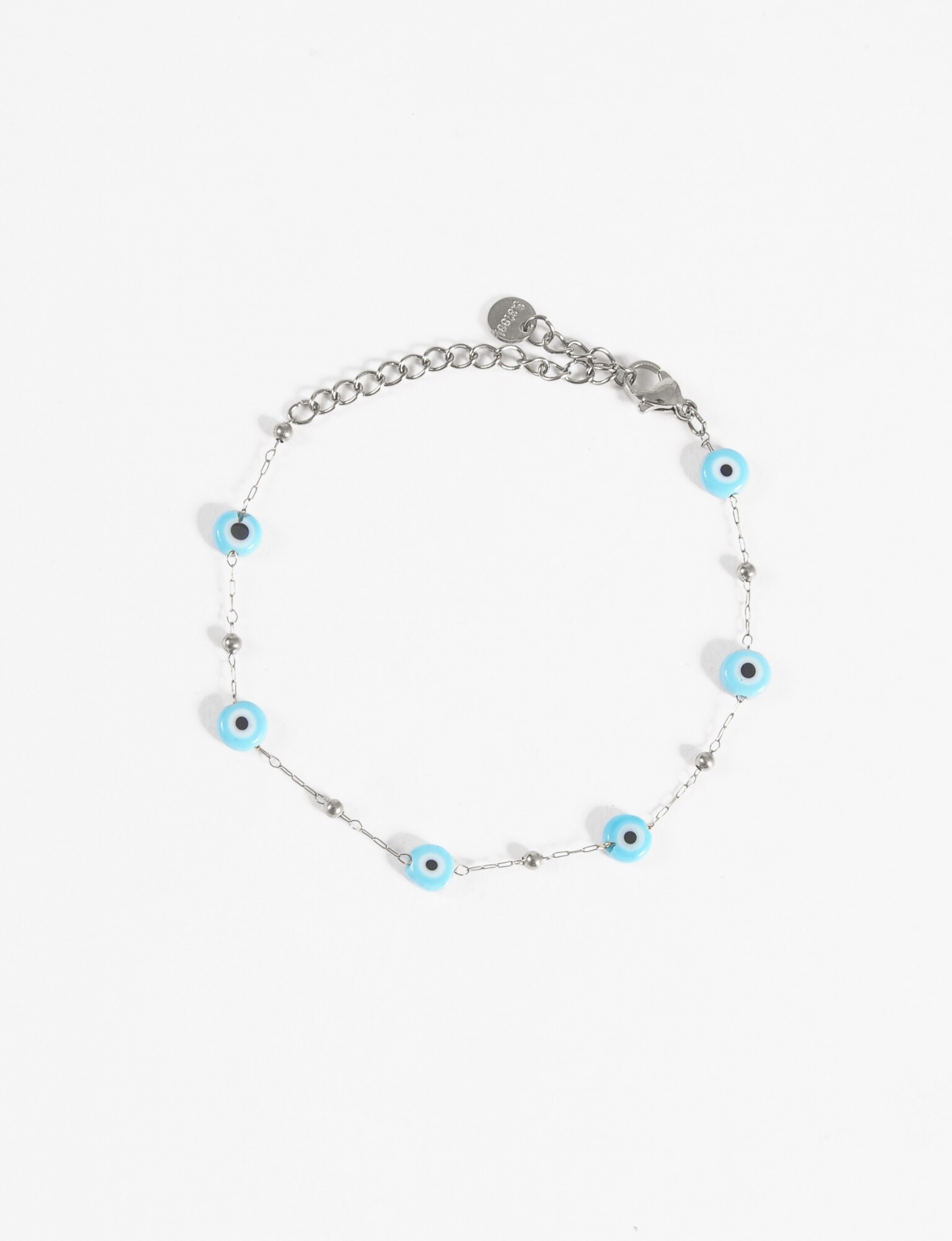 - Pulsera de acero con dijes de ojitos en cerámica.