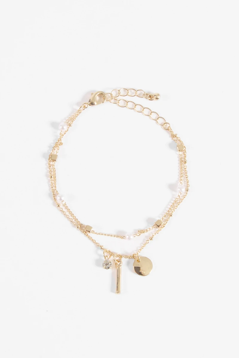 - Pulsera con dos cadenas finas y múltiples dijes metálicos colgantes.