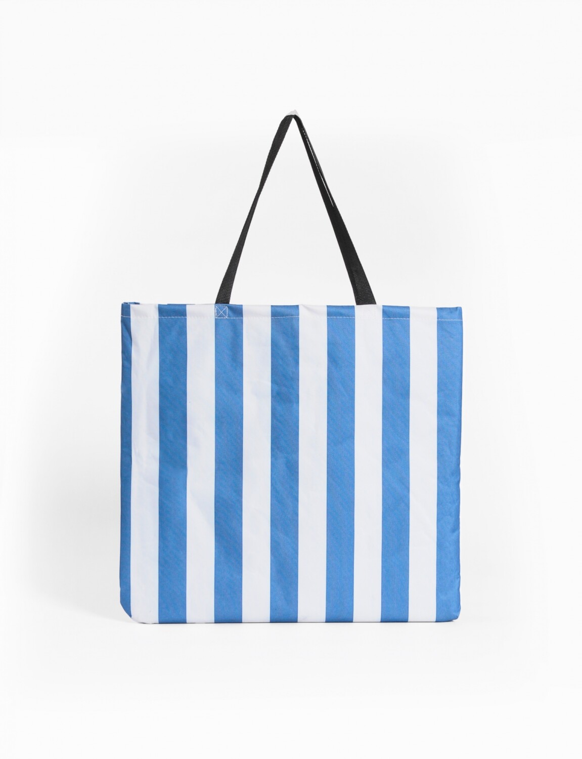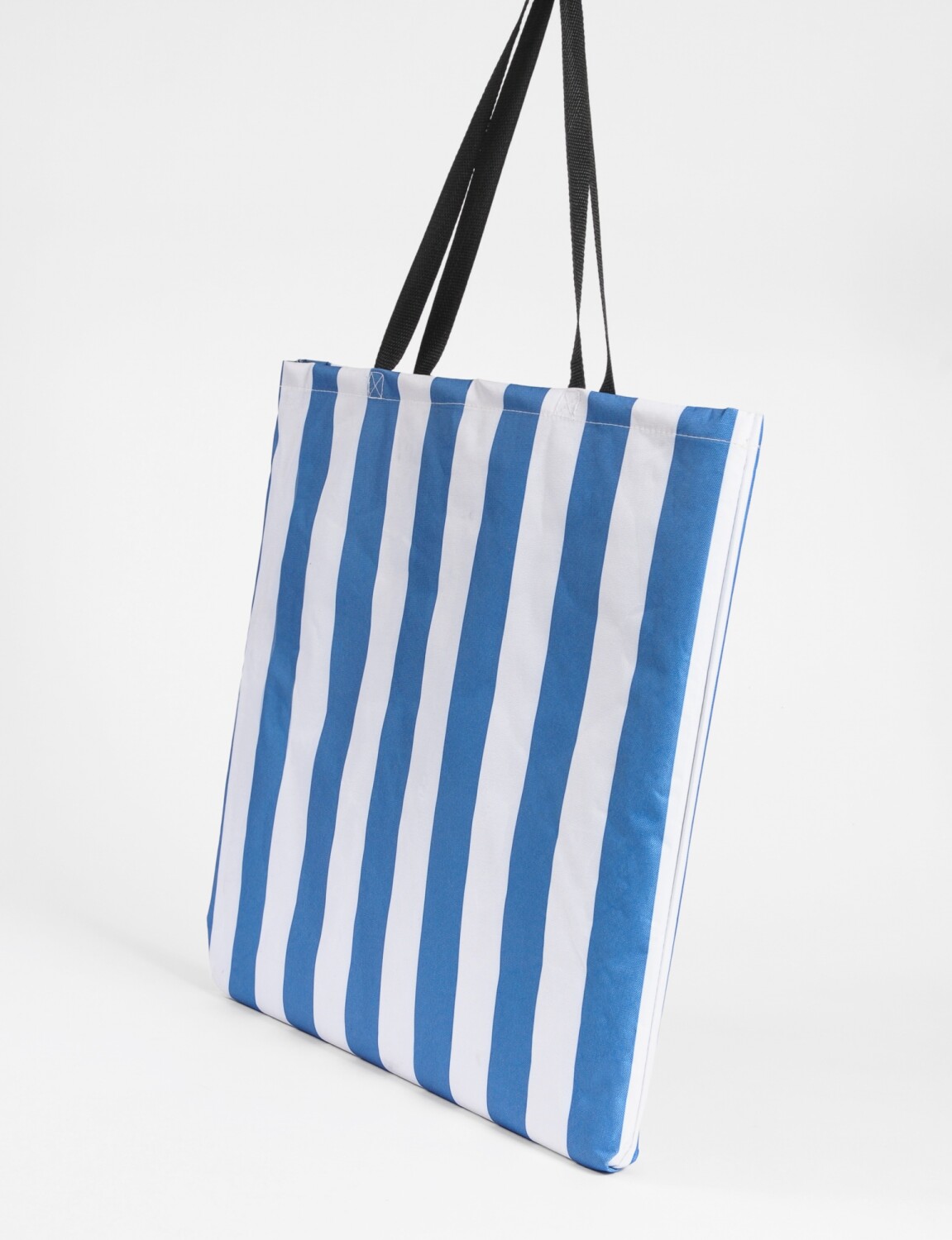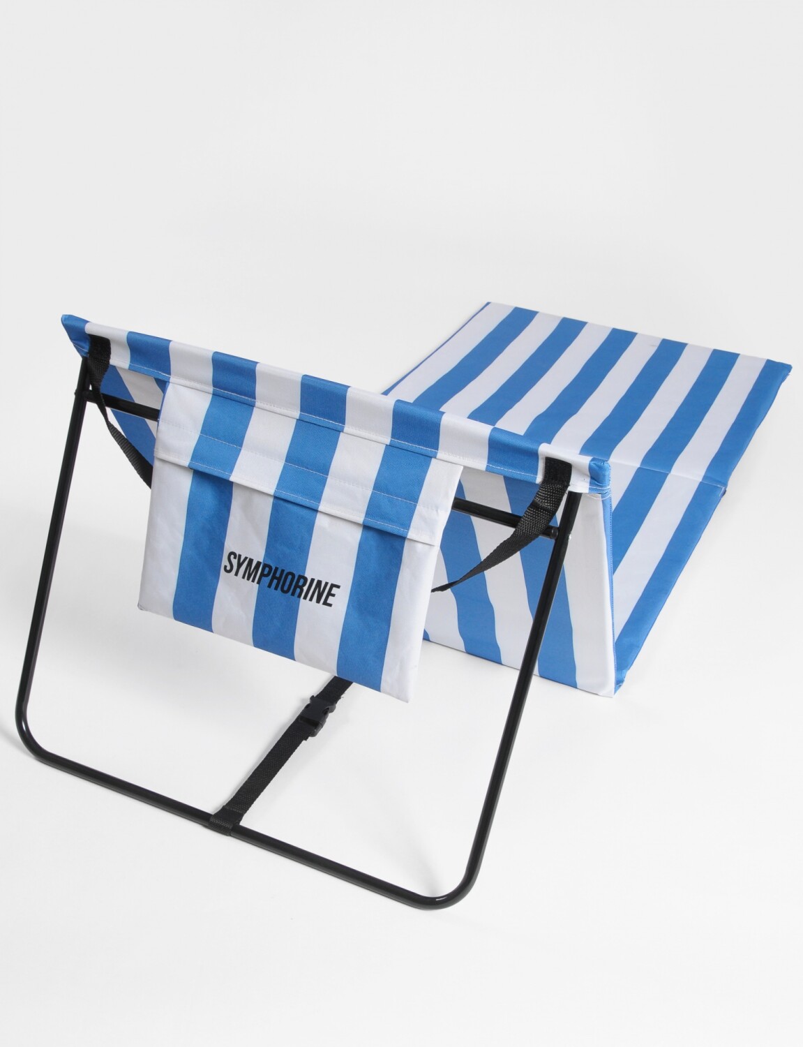 - Reposera plegable ideal para llevar a la playa, con tela rayada.
