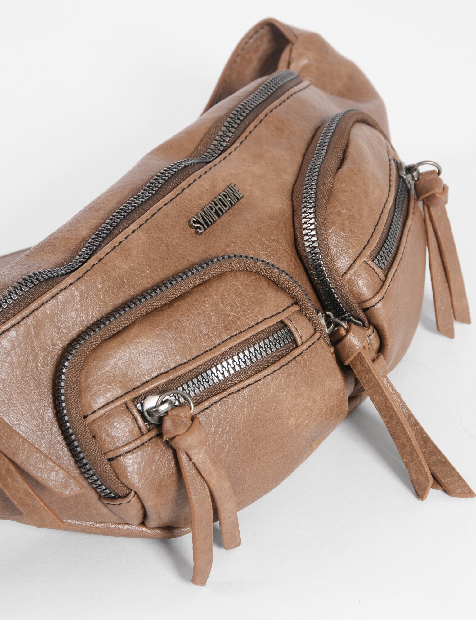 - Riñonera soft de cuero sintético con múltiples bolsillos y cierre ajustable.