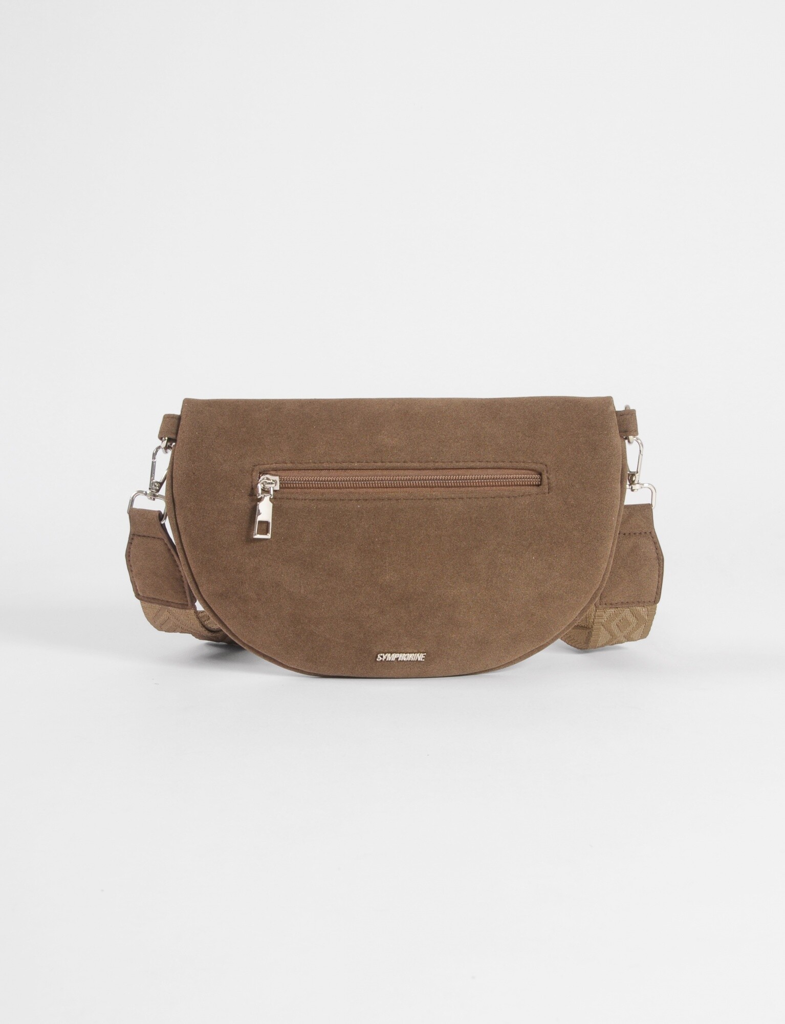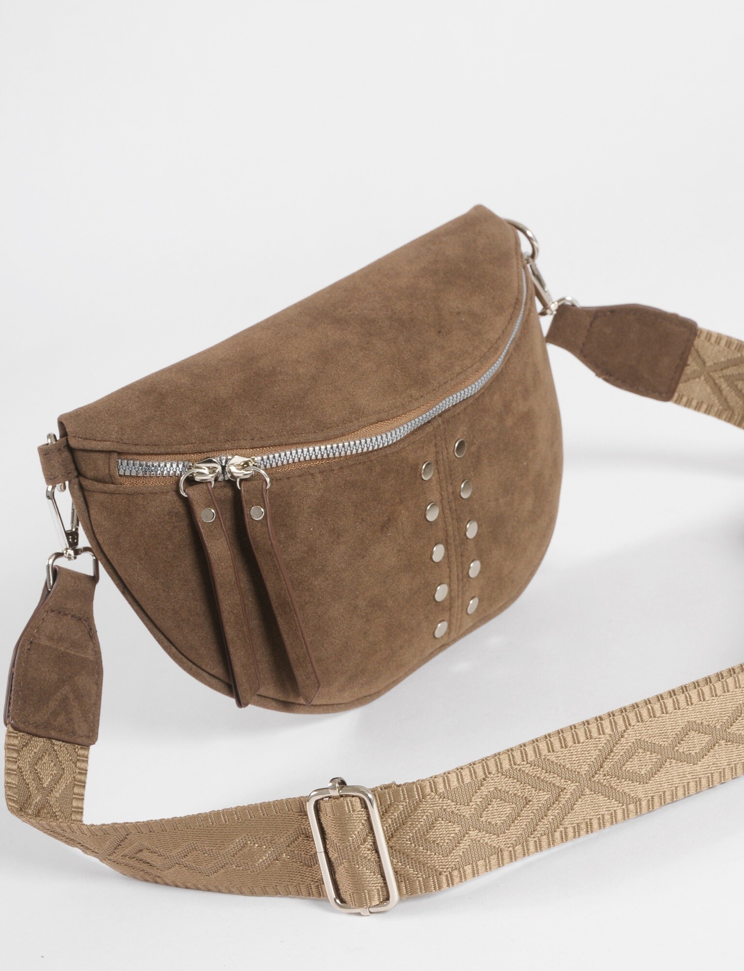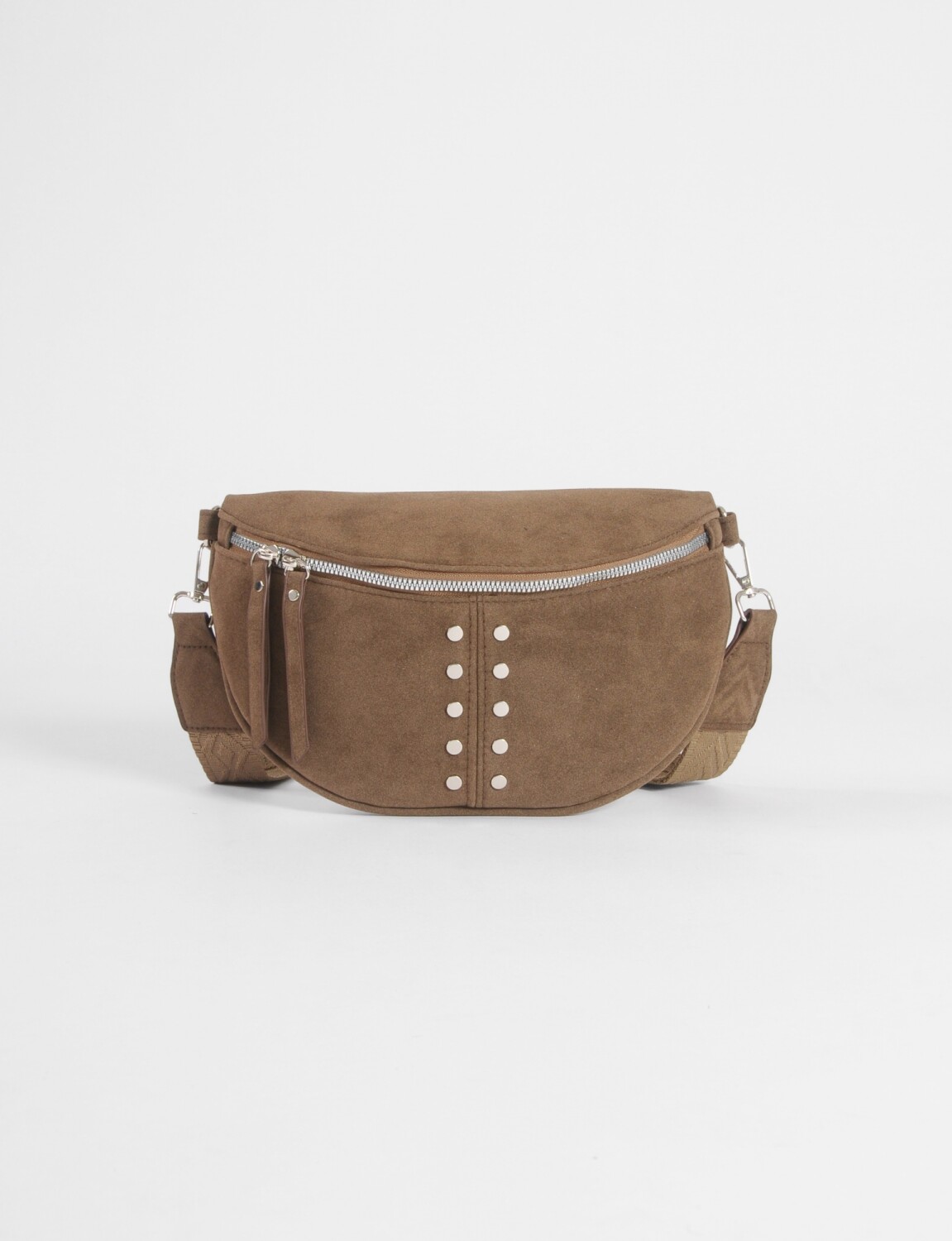 - Riñonera de símil gamuza con tachas y correa ajustable.