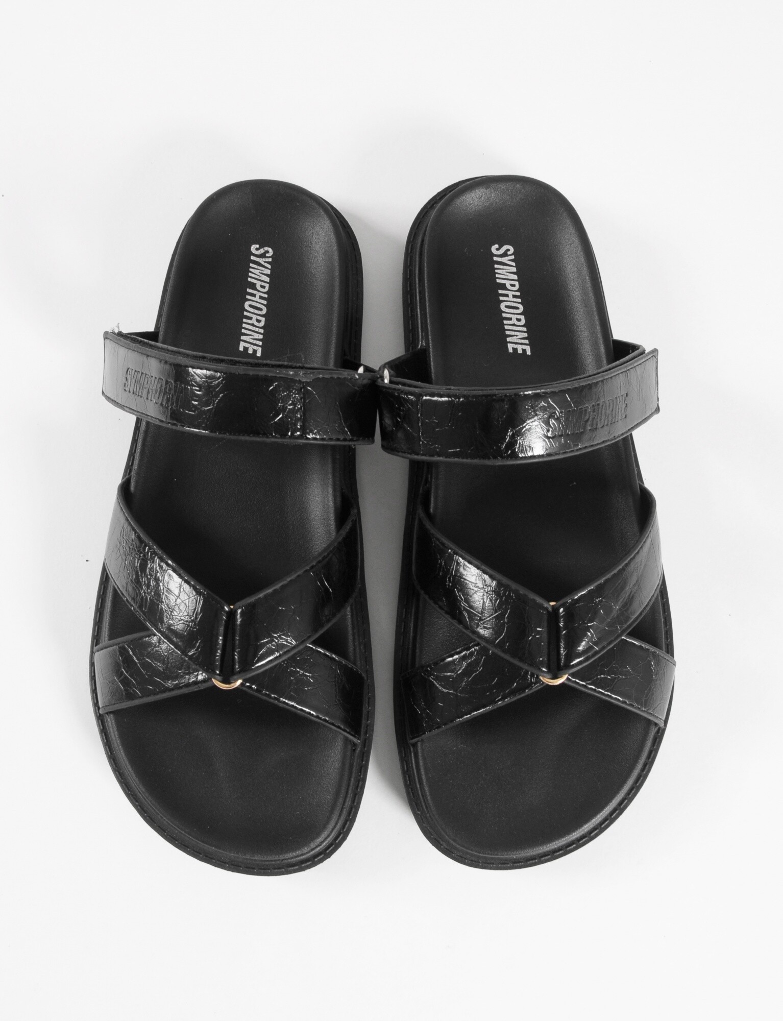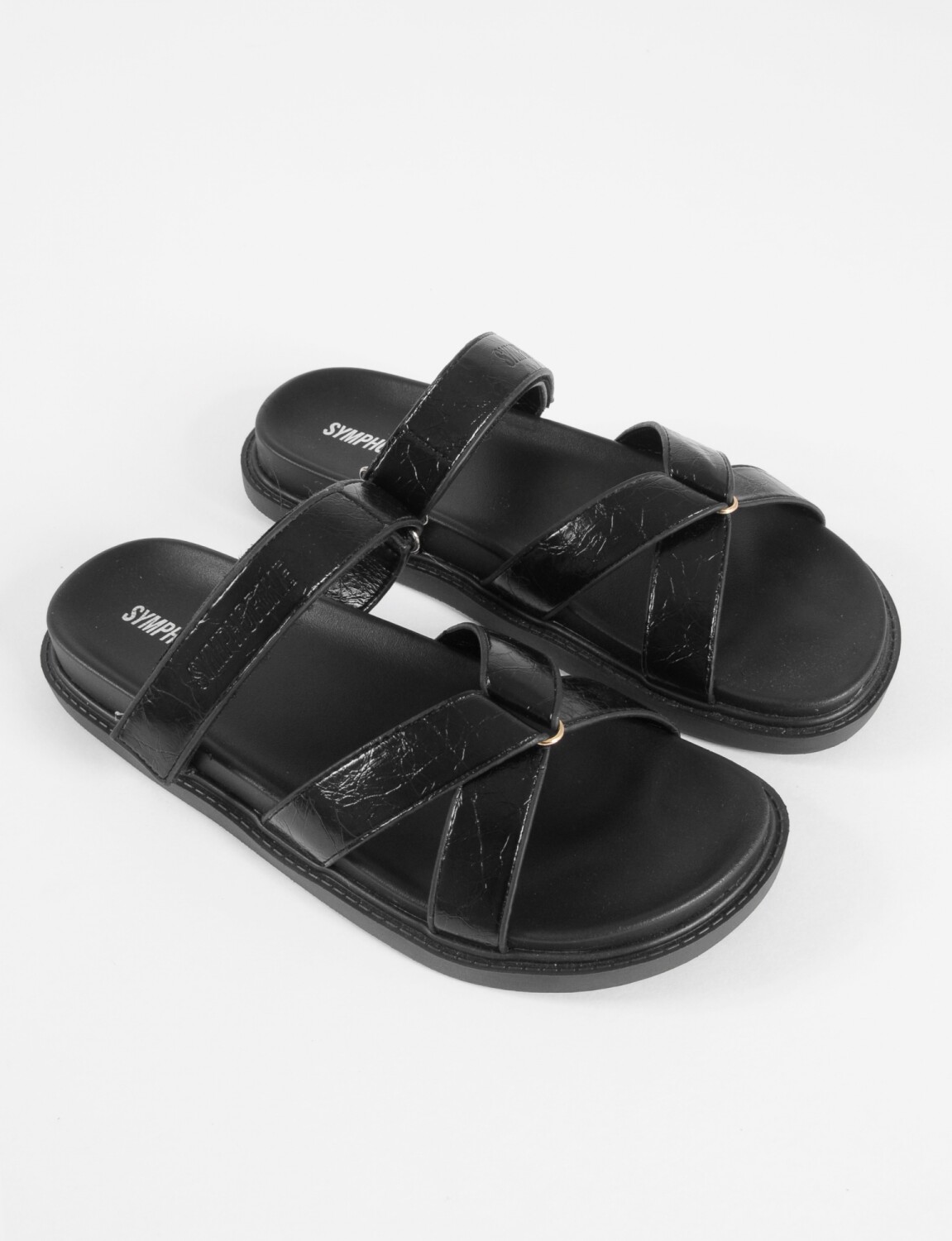 - Sandalia con tiras cruzadas en el frente y suela plana.
