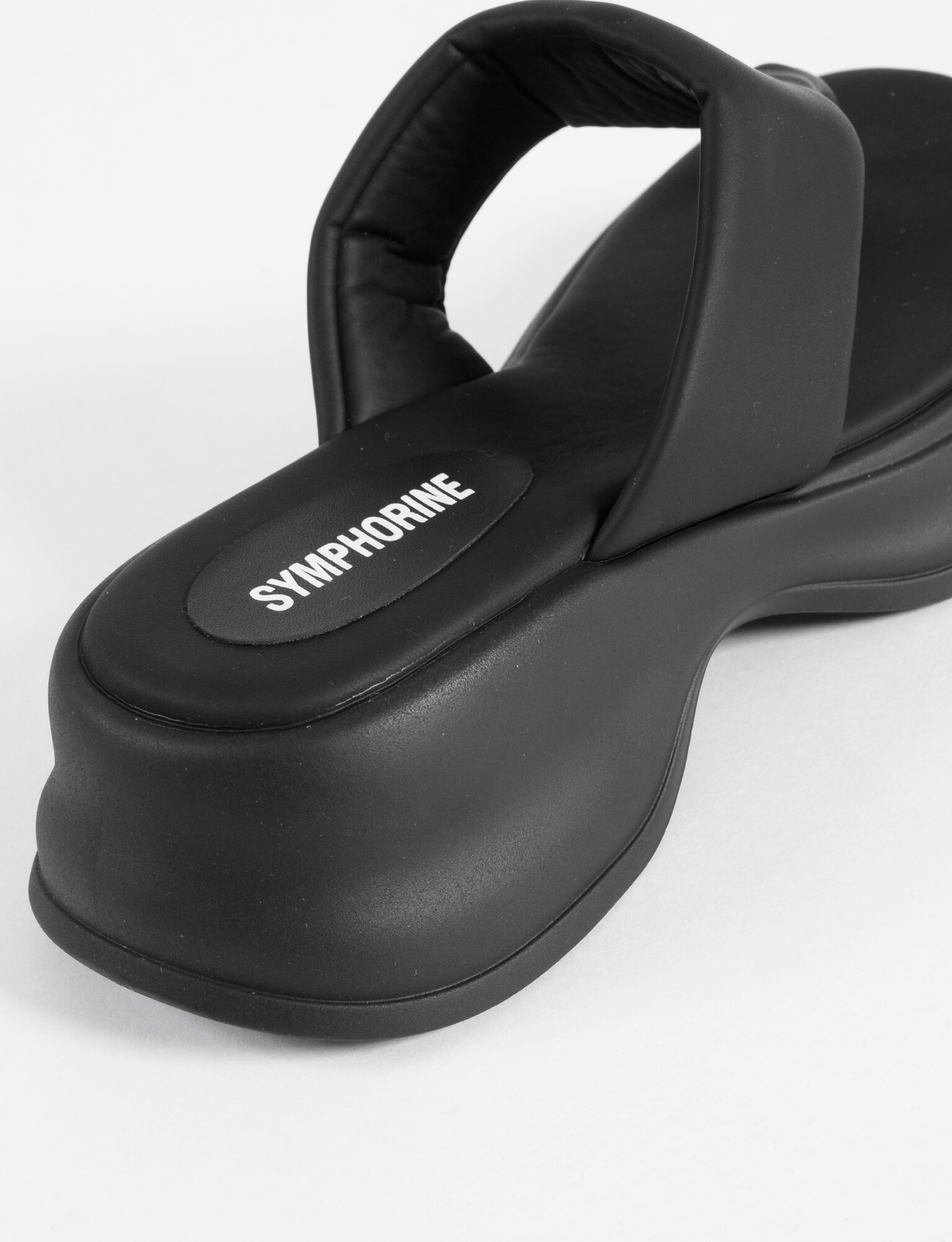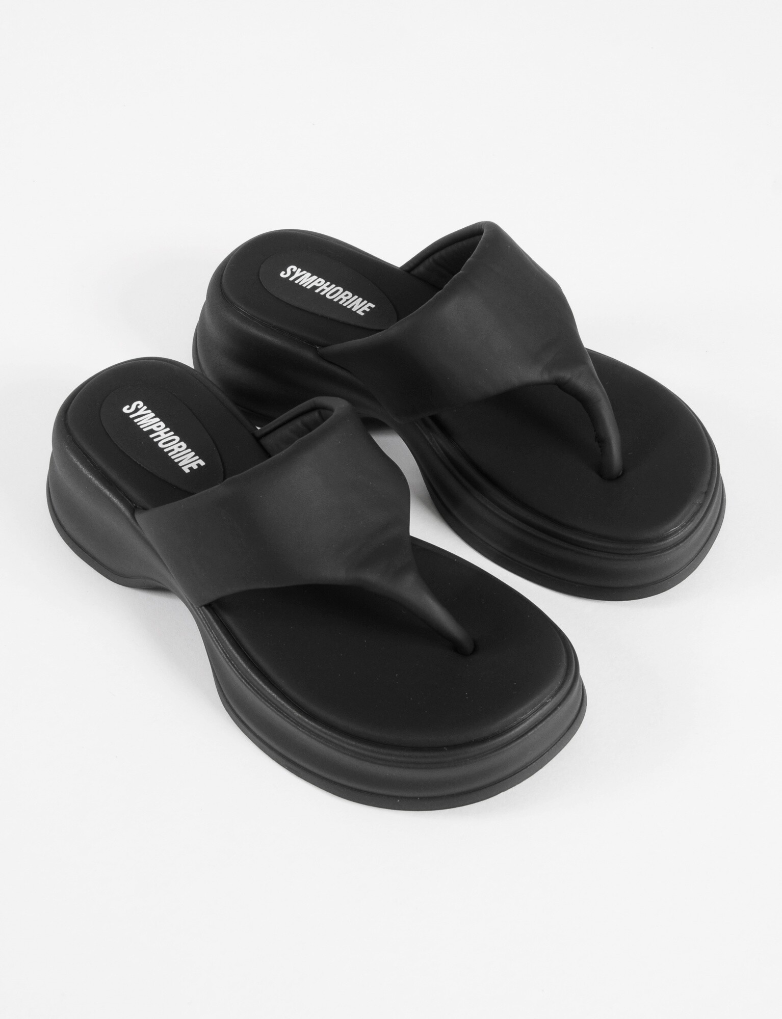 - Sandalia plana con tiras anchas y base de plataforma ligera.