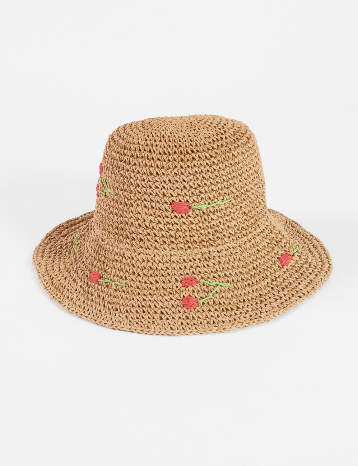 - Sombrero de papiro con cerezas bordadas en toda la copa.