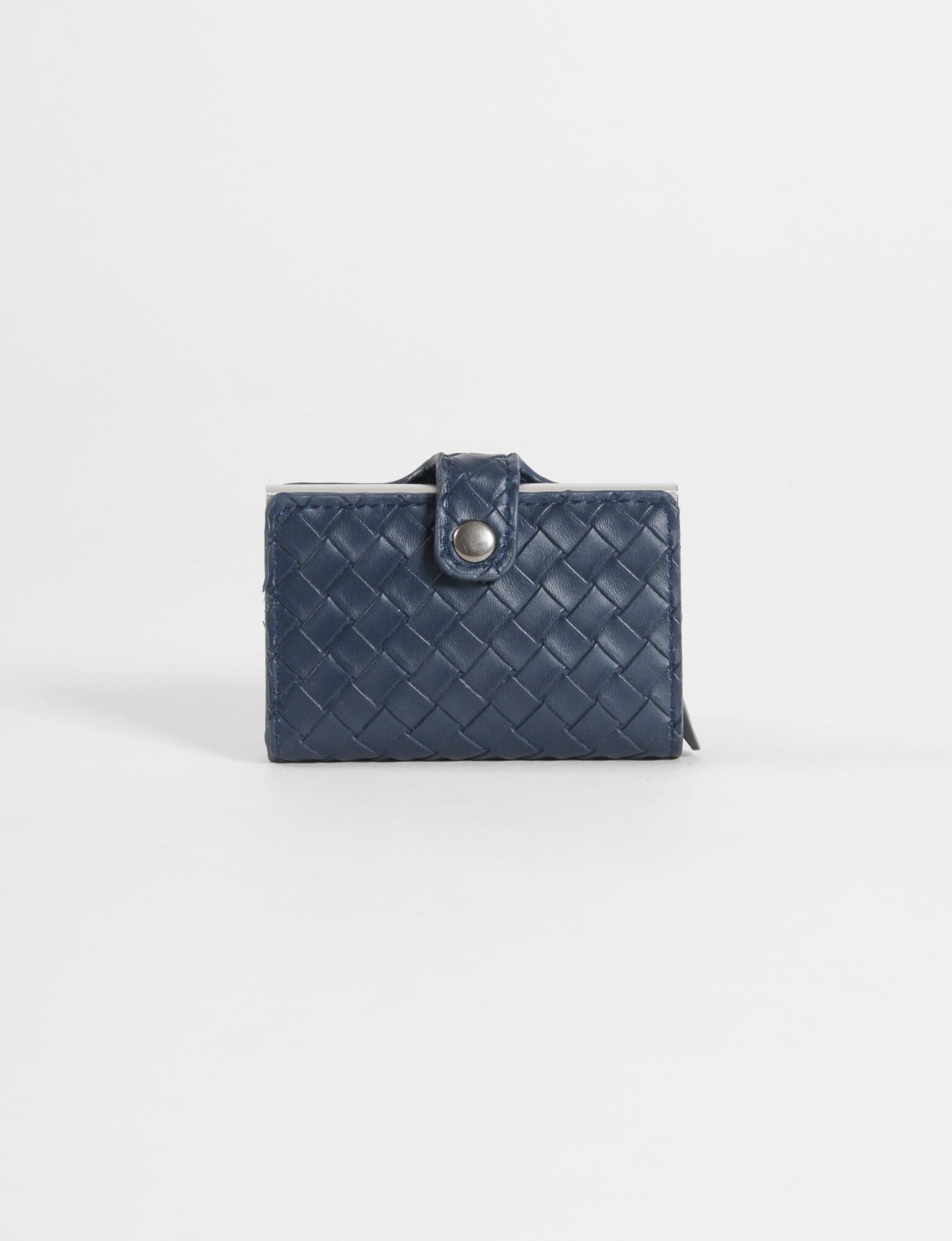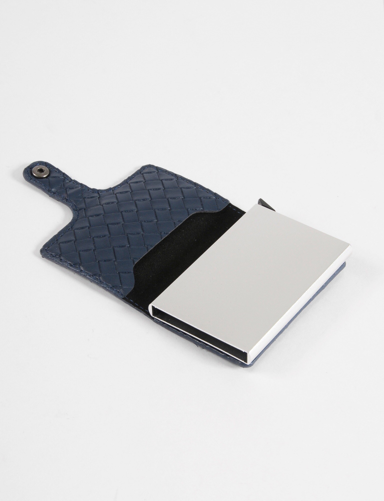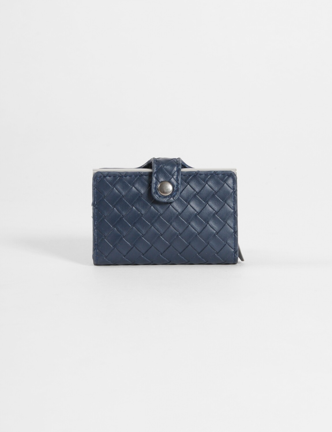 - Tarjetero rígido con textura trenzada con protección RFID contra robo.